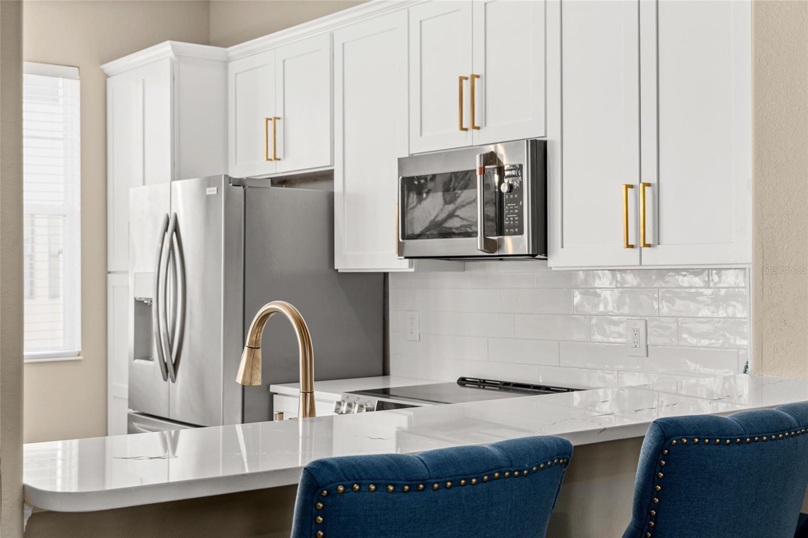 Experience luxury living in this beautifully updated home, featuring a fully remodeled kitchen (July 2024) which include: Cambria Inverness Frost quartz countertops (lifetime warranty), soft-close cabinetry, GE Café appliances, a Frigidaire refrigerator, gold stainless steel sink, Delta faucet, modern backsplash, and designer lighting.