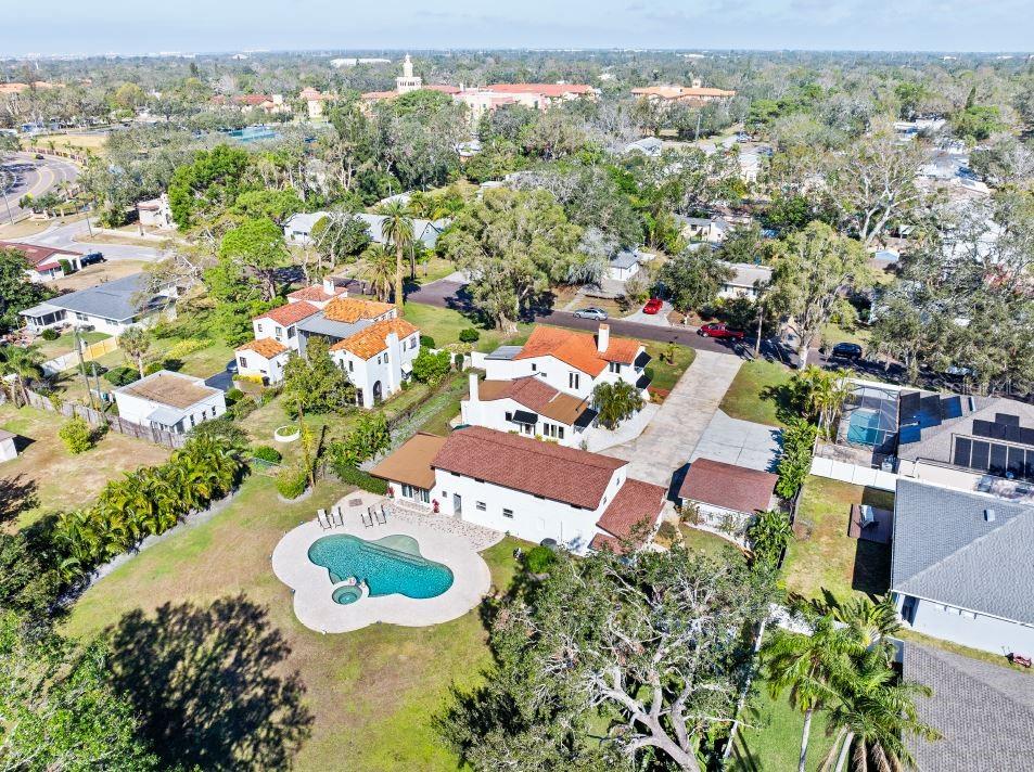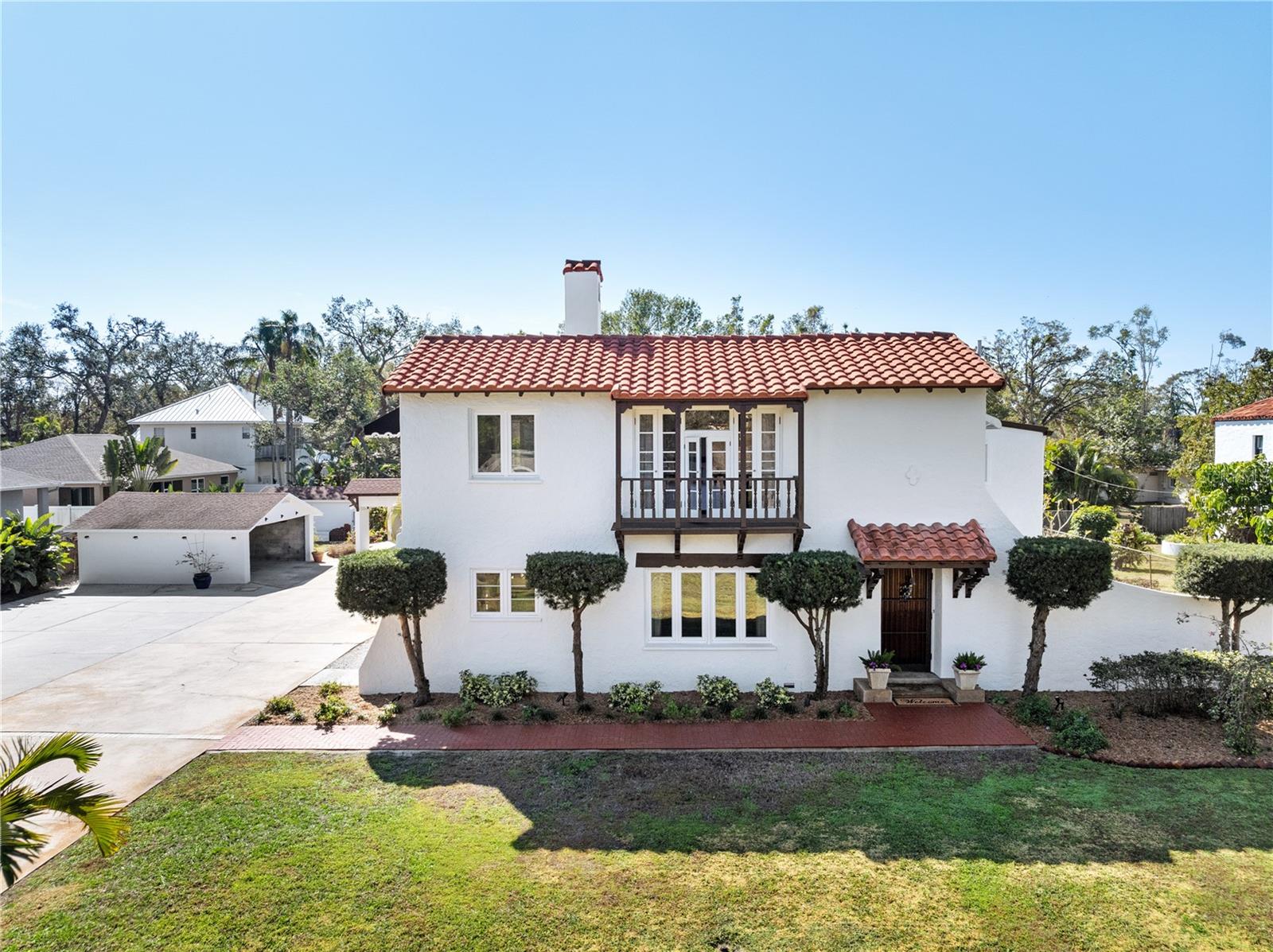 Perched approximately 19FT above sea level, your Dream Retreat Awaits. Discover this exquisite 1923 Spanish Mediterranean Revival pool home, gracefully nestled on nearly a full acre in the vibrant heart of Gulfport, Florida. From the moment you step through the front door, you're greeted by timeless elegance and authentic architectural details. The formal living room exudes warmth and character, featuring a grand gas fireplace, original wood floors, rich wooden ceiling beams, and an abundance of natural light streaming through expansive windows. Through classic French doors, escape to a charming library adorned with original Cuban tile flooring and direct access to the outdoors — the perfect setting for quiet reading or afternoon reflection. A graceful archway leads to the formal dining room, ideal for hosting memorable dinners. The spacious family room is lined with windows offering tranquil views of the garden and historic carriage house, creating a seamless blend between indoor luxury and outdoor serenity. On the first floor, an inviting en-suite bedroom impresses with a dramatic arched entry and a private stone fireplace. The gourmet kitchen is a chef’s delight, boasting soaring ceilings, exquisite heart-of-pine floors, a six-burner gas range, stainless steel appliances, and a unique step-down walk-in pantry for abundant storage. A charming half bath completes the main floor. Upstairs, the main en-suite bedroom offers a private balcony with period details — a serene perch to enjoy the Gulf breeze. The third bedroom is currently styled as a sophisticated home office. A luxurious guest bath features a marble walk-in shower, marbled floors, and a classic claw-foot tub. The separate Carriage House offers exceptional versatility. Its first floor hosts a private guest en-suite with sliding doors opening to the heated saltwater pool and lush grounds, as well as a dedicated laundry room. Upstairs, a spacious, light-filled open room currently serves as a gym, complete with its own marble bathroom. Ample parking includes a 2-car garage, an additional 1-car carport, a detached 2-car carport, and a large driveway pad. The fully fenced backyard, with rear lane access, is an oasis of privacy and beauty. Located outside of the flood zone and just minutes from the vibrant offerings of Gulfport, St. Petersburg, Tampa, and Sarasota — this exceptional estate blends timeless charm with modern comfort.