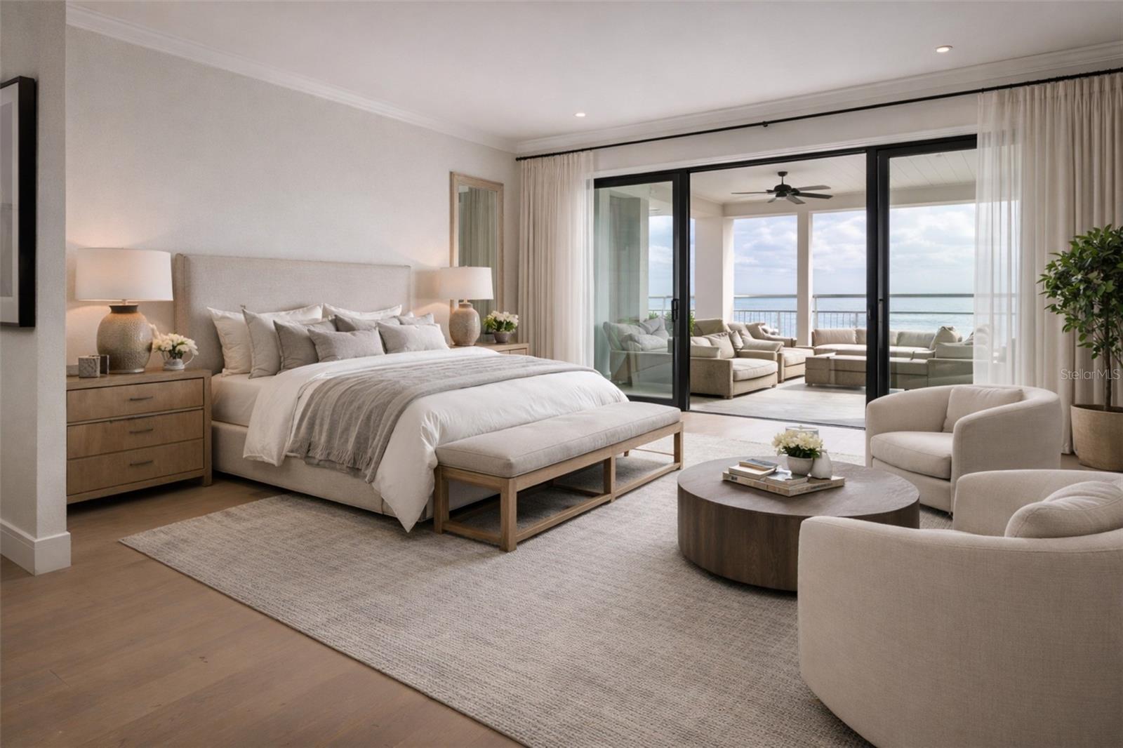 A dramatic open-concept floor plan seamlessly connects the main living spaces, creating an ideal setting for both everyday living and grand entertaining. The chef’s kitchen anchors the home with an elite appliance package, expansive center island with seating for five, custom cabinetry, and a large walk-in pantry, all overlooking the water for an inspired culinary experience. A climate-controlled, glass-enclosed wine room adds a striking architectural statement and refined touch.
