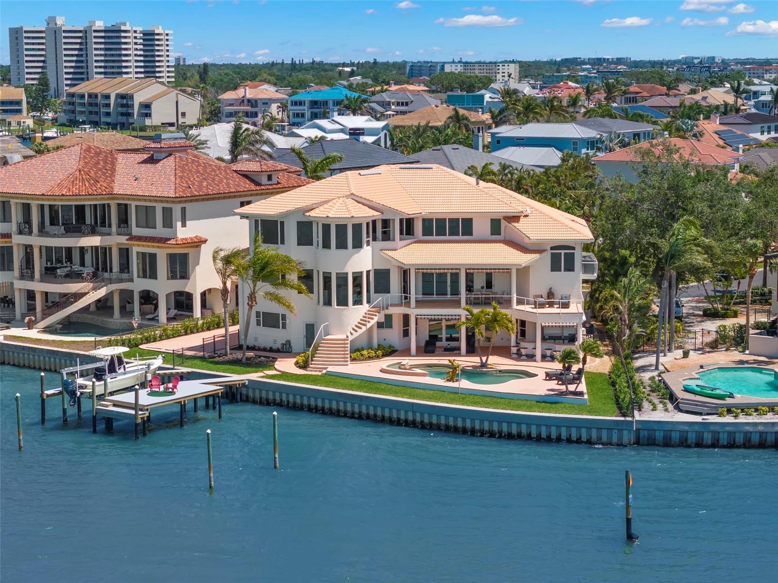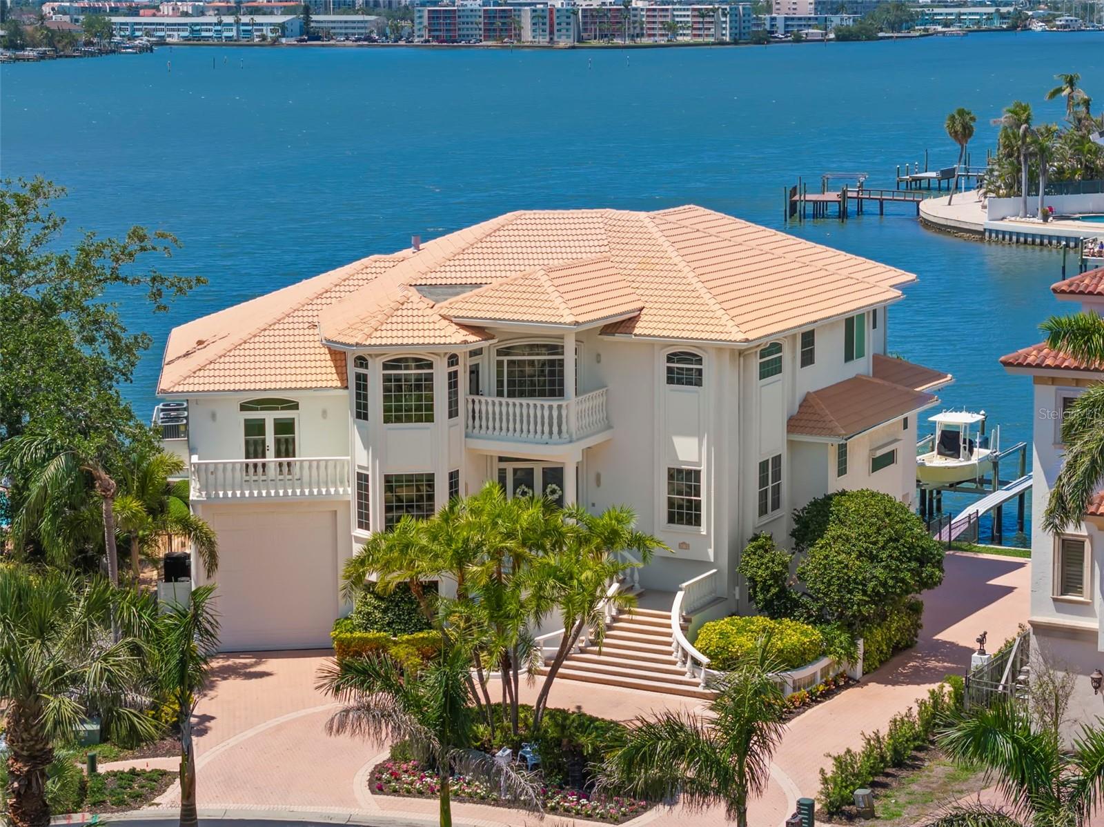 Welcome to a masterpiece of luxury and design in the prestigious Pasadena Yacht and Country Club, where this spectacular Kipps Colony Estates residence offers an unparalleled waterfront lifestyle. With over 140 feet of prime open waterfront, this home provides breathtaking vistas of Boca Ciega Bay, promising unforgettable Florida sunsets and a front-row seat to vibrant marine life. Spanning an impressive 5,254 square feet, and over 9,600 square feet under roof, this residence is a testament to spacious elegance. A sprawling RV garage, oversized three-car garage, workshop, and expansive storage cater to all your lifestyle needs. Enter through the double leaded glass doors into a world of grandeur, where the living area impresses with soaring ceilings, marble flooring, a cozy gas fireplace, and walls of sliding doors that blur the line between indoor and outdoor living. Designed for entertaining, the expansive rooms and seamless flow make hosting large gatherings a joy. The chef’s kitchen is a culinary haven, featuring solid wood custom cabinetry, granite countertops, a cooking island, walk-in pantry, and a breakfast bar with views of the family room and waterfront beyond. This fabulous layout includes an elevator servicing all levels and four spacious bedrooms, including two primary suites perfect for multigenerational living. The top floor is dedicated to an enormous primary suite, a private sanctuary with a waterfront sitting area, outdoor deck, luxurious ensuite bath, and double walk-in closets with a custom system. A separate guest suite on the opposite wing offers privacy and comfort. The home’s outdoor spaces are an entertainer’s dream, highlighted by a concrete bar overlooking a stunning pool with a pebble tech interior and multiple fountains. For boating enthusiasts, the location is ideal, featuring a wet slip for a 60-foot yacht, a 10,000-pound boat lift, and a brand new 42.6-foot composite dock. Embrace the ultimate in waterfront living, where luxury knows no bounds, and every detail is crafted for an extraordinary lifestyle in the coveted Pasadena Yacht and Country Club.