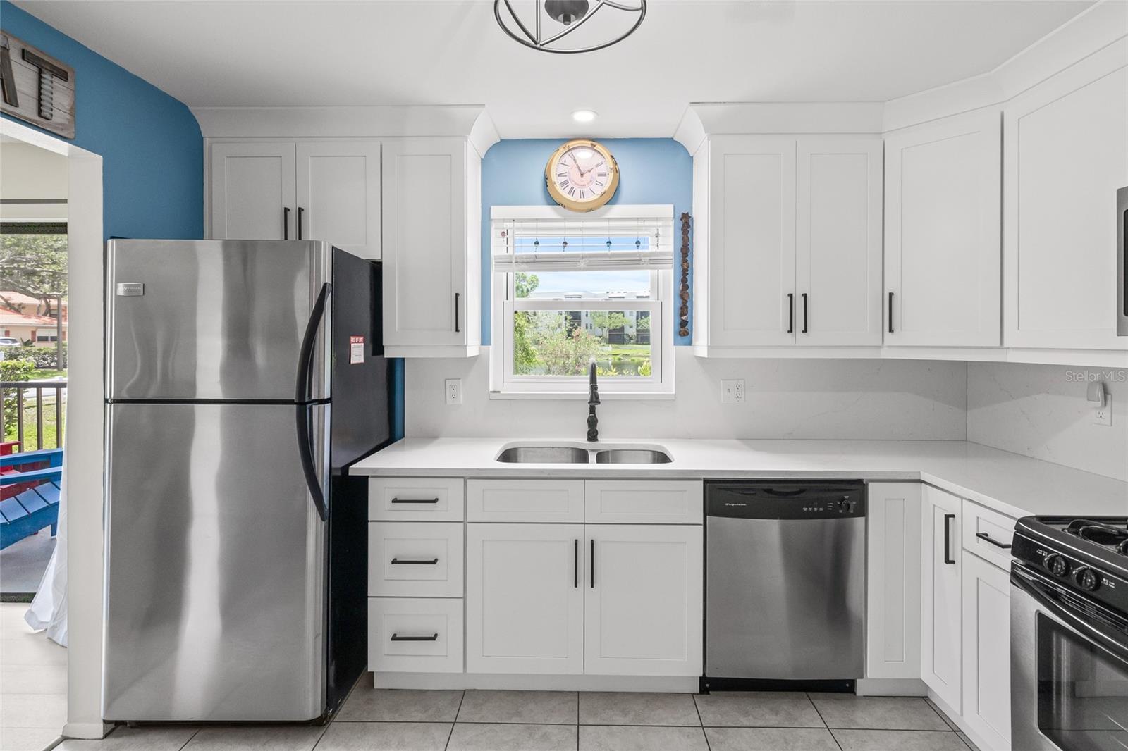 Move-In Ready Water View Condo in the sought-after 55+ community of Five Towns. Discover carefree living in this beautifully updated first-floor END/CORNER UNIT with tranquil water views, located in the desirable, pet-friendly Princeton building of Five Towns. This spacious 2-bedroom, 2-bathroom condo spans 1,360 square feet and is designed for comfort, style, and minimal upkeep. Natural light pours through hurricane-impact windows (2020), highlighting the neutral color palette and tasteful new light fixtures throughout. AC unit (2022) with blue light filter, oversized in-unit laundry room with full-sized washer and dryer add modern convenience. Renovated kitchen is a true standout, featuring updated cabinetry with pantry pull-outs, soft-close drawers, quartz countertops, stainless steel appliances, and a coveted gas range—ideal for any home chef. Just off the kitchen, enjoy a bright laundry room with pond views and ample storage. The living room, located next to the kitchen, has plenty of seating for guests- Enjoy watching movies on the 76 inch TV which conveys! From the living room, step outside to your screened porch and take in peaceful pond views while sipping your morning tea. The primary bedroom offers generous space for a king-sized bed, plus a walk-in closet and an updated en-suite bath with an easy step-in shower. A second spacious bedroom is located adjacent to the guest bath which features a full size tub. Additional highlights include: BRAND NEW ROOF (2025), designated parking spot, guest parking and a completed milestone report. Princeton is also fully funded. Indulge in the Five Towns extensive amenities: 6 swimming pools, fitness center, tennis courts, pickleball, walking trails, bocce ball, billiards, and various clubs and educational groups. Located just minutes from the Gulf beaches and under 30 minutes from two international airports, this home offers comfort, convenience, and community. Best of all, no damage or flooding from Hurricane Helene and Milton. Schedule your private showing today!