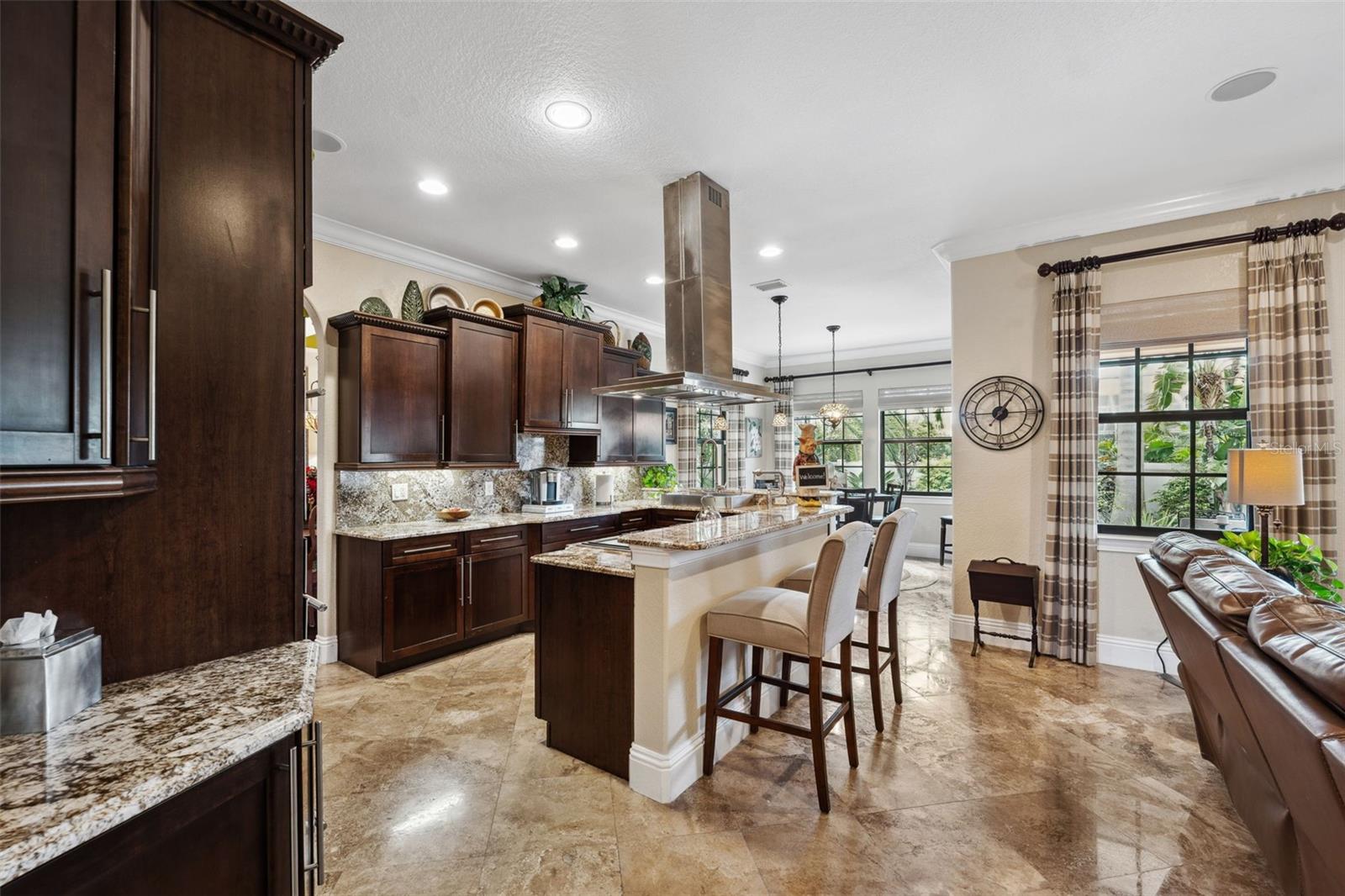 Welcome to your dream home in the beautiful island community of Tierra Verde! This stunning 4-bedroom, 4-bathroom residence spans 4,414 SF and boasts luxurious features that will captivate even the most discerning buyers. As you step into this remarkable home, you are greeted by an impressive 25 ft cathedral entryway, setting the tone for the grandeur that awaits. The enviable gourmet kitchen is a chef's delight, equipped with top-of-the-line stainless steel Jennaire appliances, including a 6-burner gas cooktop and a built-in refrigerator. The gorgeous custom solid wood cabinetry is completed with exquisite granite countertops and 2 breakfast bars, overlooking the casual dining area and family room with a cozy fireplace and coordinating wet bar with wine refrigeration and an ice maker.