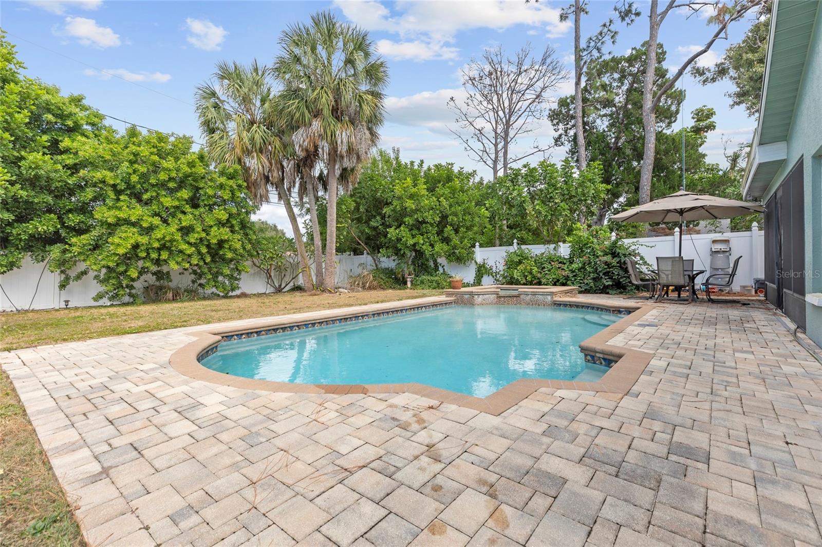 From the porch, step out to your private backyard oasis featuring a resort-like saltwater pool and spillover spa perfect for weekend gatherings, surrounded by a vinyl fence for privacy and plenty of room for family, pets, and gatherings. The porch can also be accessed from the dining area, blending indoor and outdoor living effortlessly.