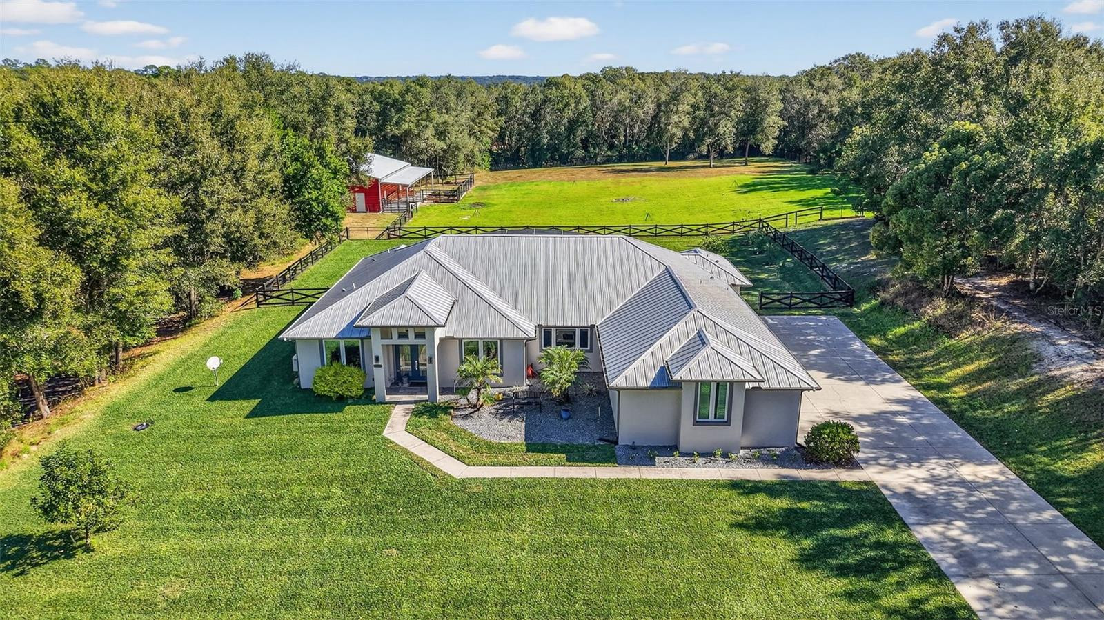 Enjoy peace, privacy and open space the minute you turn down the tree-lined driveway in this custom-built 2018 home. Situated on 5.8 acres just minutes from historic Downtown Mount Dora, this modern house has been thoughtfully designed for indoor-outdoor living with an open-concept living and dining room featuring sliders that open out to an expansive lanai. The saltwater pool is completely screened and overlooks the serene pasture, creating the perfect space for entertaining or quiet relaxation. Inside, the kitchen is a beautiful gathering spot with a sprawling cooktop island, quartz countertops, farmhouse sink, built-in appliances and custom cabinetry. The large, oversized windows in every space allow you to soak in the natural beauty and privacy this property affords. Retreat to the primary bedroom with pool views, an electric fireplace and luxurious en-suite bath complete with a walk-in shower, separate vanities and ample walk-in closets. Enjoy easy access to the laundry room directly from the primary suite. The split floor plan provides the two guest bedrooms with privacy, each with their own bathroom. And the dedicated office space is both beautiful and practical with double-door entry and another oversized window.