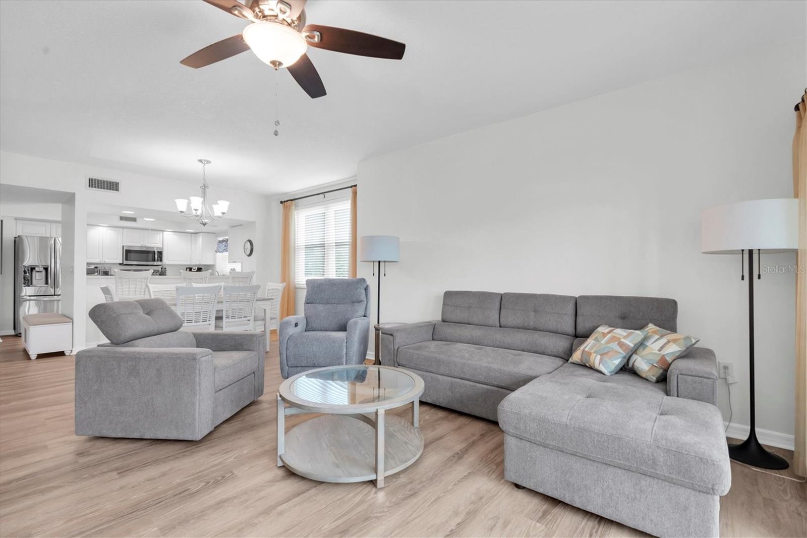 Inside, you’ll find tall ceilings, abundant natural light, newer luxury vinyl flooring, and hurricane-impact windows throughout. The primary suite is a true retreat with two walk-in closets, a spacious bathroom with dual sinks, a vanity, and a large walk-in shower. Two generously sized guest bedrooms share a second bath with a tub and shower combination.