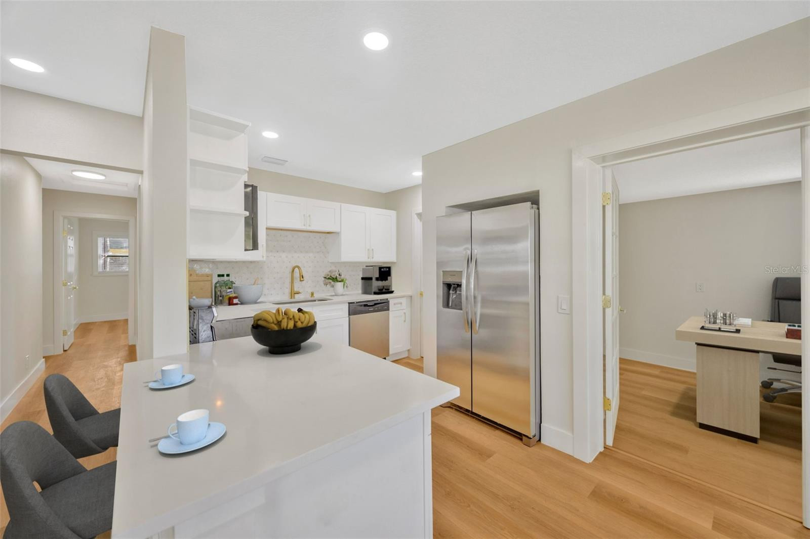 One or more photo(s) has been virtually staged. Welcome to 6608 S Mascotte Street, a fully remodeled and fully permitted South Tampa home offering 3 bedrooms, 2 bathrooms, and a versatile flex space ideal for an office, den, or 4th bedroom. This home has been completely transformed with all major systems replaced, including a new roof, new A/C, new water heater, and a full re-pipe. Double pane windows throughout. The interior features fresh paint, new luxury vinyl plank flooring throughout, and a modern open layout that blends comfort and style. The kitchen showcases shaker cabinets, quartz countertops, gold fixtures, stainless-steel appliances, and a beautiful marble backsplash with gold accents. Both bathrooms have been beautifully updated with navy vanities, quartz counters, and elegant marble-style tile. The exterior boasts new sand-finished stucco, fresh paint, a fenced yard, new front irrigation system, and new sod for excellent curb appeal. Ideally located just minutes from MacDill AFB, Picnic Island Park, Gandy Bridge, and downtown Tampa, this home combines quality craftsmanship with a prime South Tampa location—completely move-in ready and built to impress.