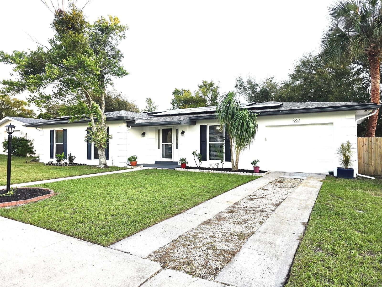 Remodeled 3 bedroom/2 bath/1 car garage home in the heart of Deltona! Wood laminate throughout the home with tile in the bathrooms and kitchen. All new kitchen - wood cabinets, stainless steel appliances, tile flooring. lighting, fixtures, etc. Master bath and hall bath have been updated. The rear porch is 17 x 10 and is fully enclosed with a new roof and window AC for additional heated/cooled square footage (not recorded in the current 1338 heated/cooled sq. ft. of the home). Fully fenced huge yard with large shed and fire pit. Solar panels will be paid off at closing - solar produces 14 kw of electric so additional insurance is required. Monthly electric bill is $36 per month. Great location! Centrally located - easy access to I-4 - close to Orlando, amusement park, beaches, shopping, schools, medical facilities and restaurants.