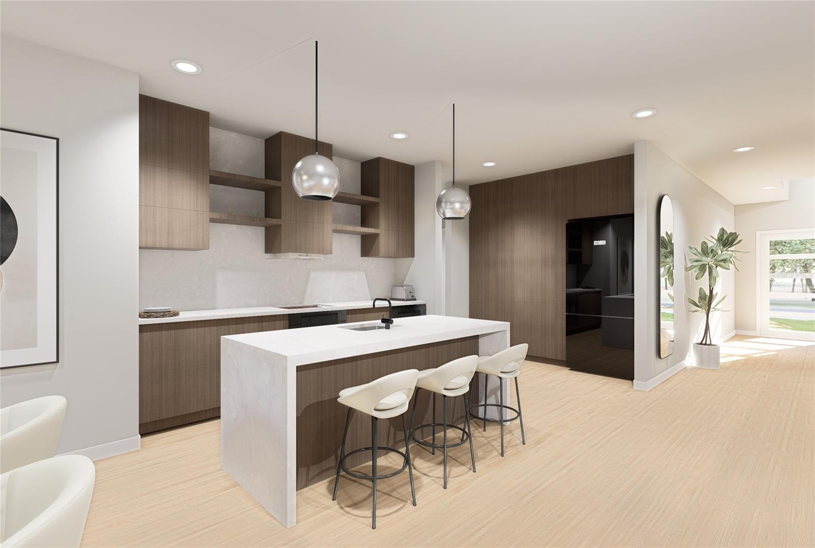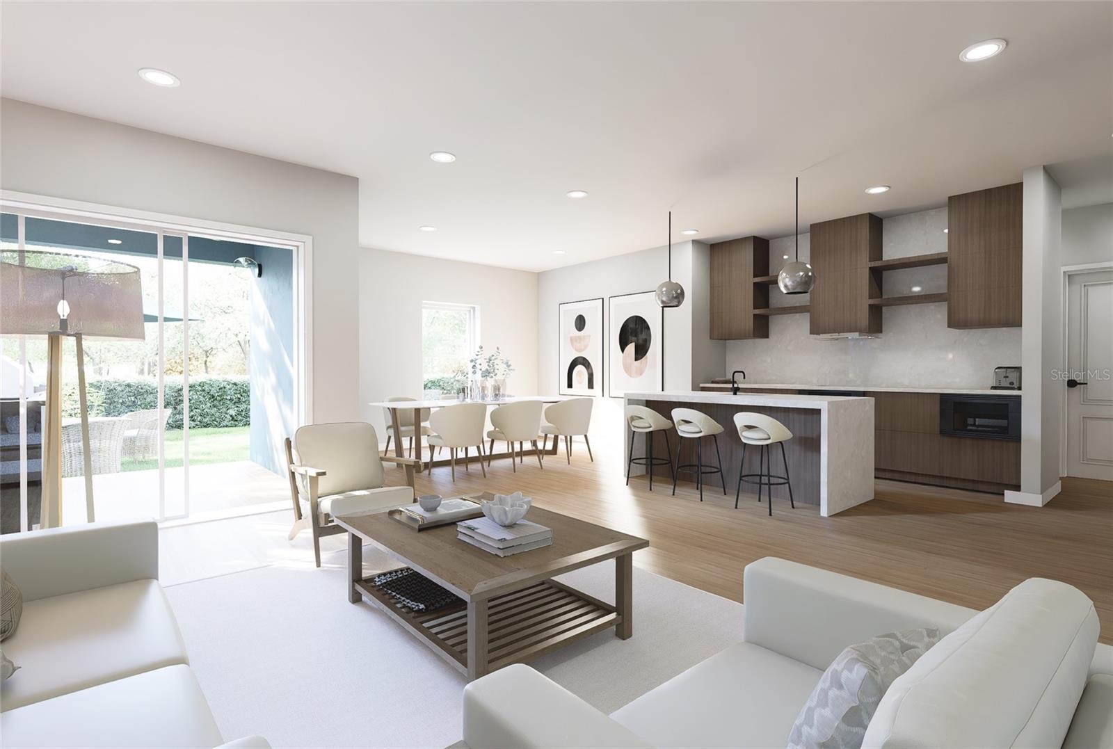 The open concept main level is designed for effortless everyday living and entertaining. A designer kitchen anchors the home with custom cabinetry, waterfall island, premium appliances, and seamless flow into the dining and living areas. Large sliding doors extend the space outdoors to a covered lanai, creating true indoor outdoor living.