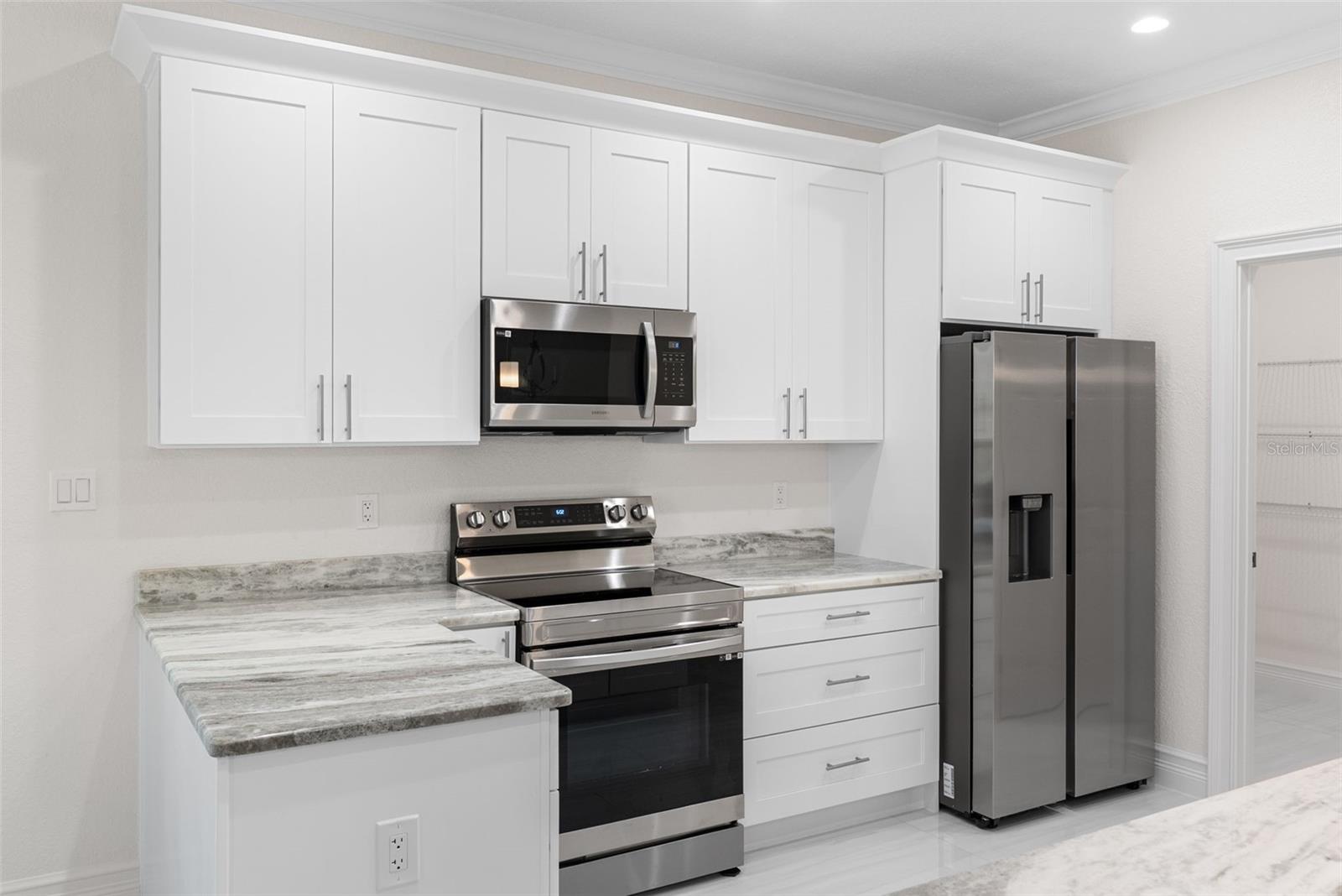 Inside, you’ll find crown molding throughout the main living areas and primary suite, creating a polished, upscale feel. The open-concept kitchen is designed for both everyday living and entertaining, featuring stainless steel appliances, sleek finishes, and a seamless flow into the living and dining spaces.