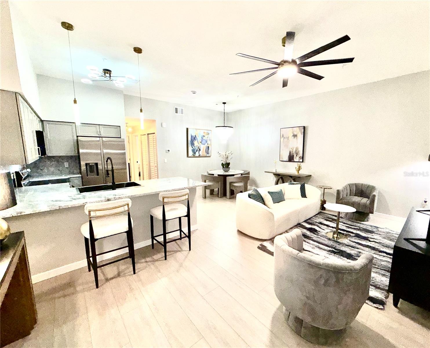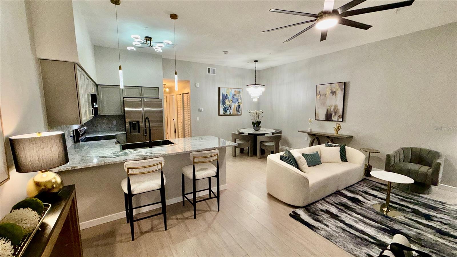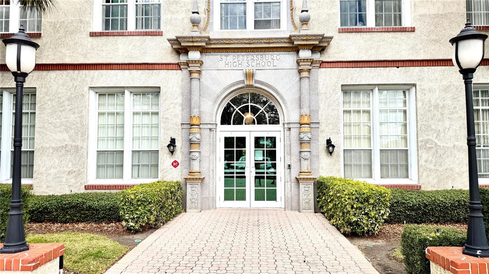 This spacious 875-square-foot condo, one of the larger units, features soaring ceilings and a complete renovation blending modern luxury with historic charm. Nestled in the iconic 1915 St. Petersburg High School building, this Mirror Lake gem boasts brand-new Samsung appliances, a GE washer/dryer, elegant new cabinets, granite counters, and a striking chevron marble backsplash. Both bathrooms have gleaming new cabinets, granite countertops, and fresh marble flooring, complemented by new bathtub tiles. Luxury vinyl floors, crisp paint, and all-new fixtures, blinds, chandeliers, fans, and trim complete the transformation. Just steps from downtown St. Pete, relish easy access to restaurants, USF, museums, theatres, and more. The community also offers a pool and library, where history and modern comfort truly come together. Mirror Lake is out front, with the neighbouring historic Coliseum and the St Petersburg Shuffleboard Club.
