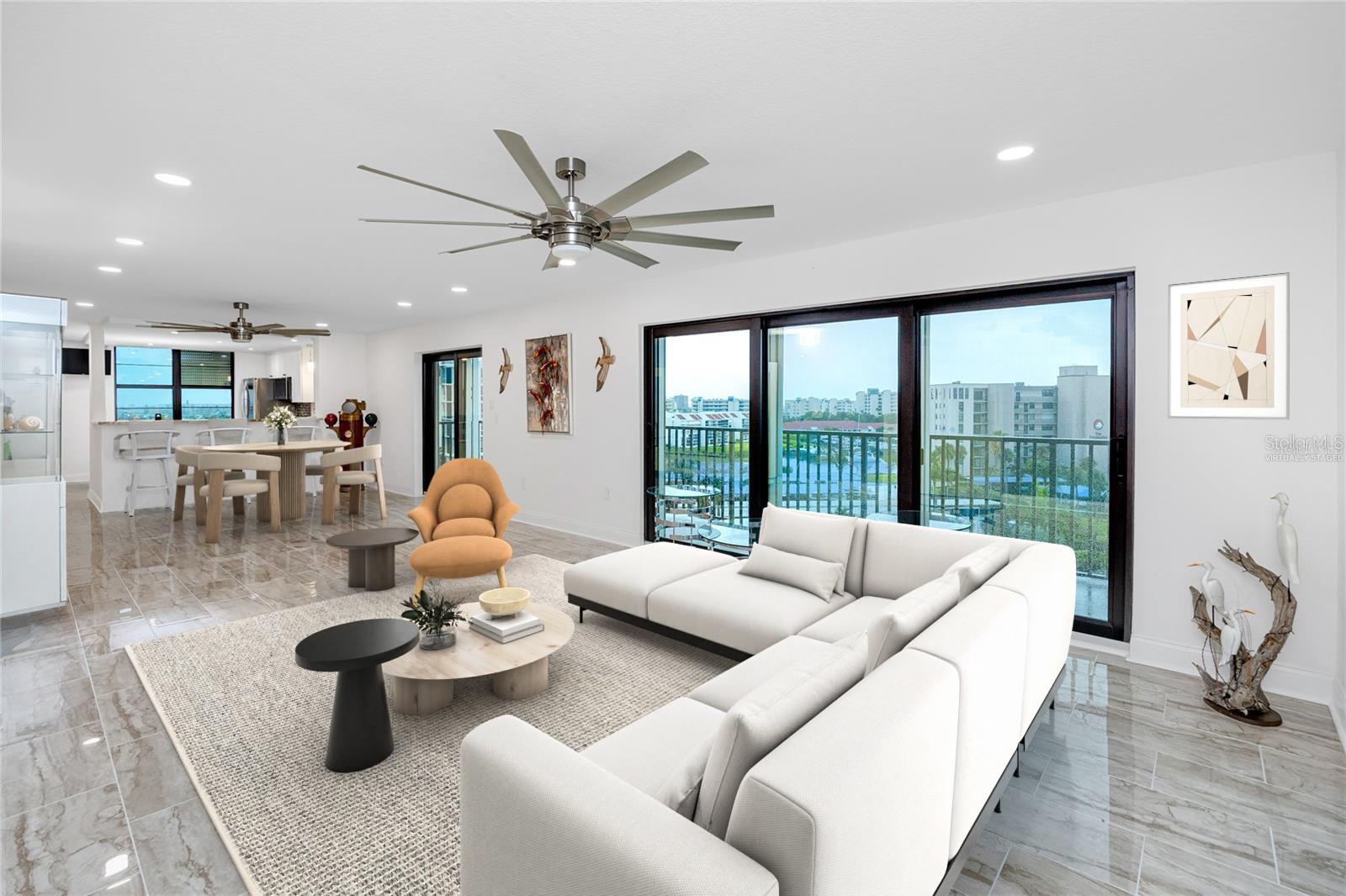 One or more photo(s) has been virtually staged. Welcome to refined coastal living in the heart of Bay Island—an exclusive 55+ gated waterfront community offering unmatched amenities and breathtaking views of Boca Ciega Bay. This rare corner residence in the highly desirable Admiral Building offers 1,375 square feet of meticulously renovated living space, with over $100,000 in designer upgrades that elevate both style and functionality. A custom privacy gate leads to your own private entryway, providing a secure and quiet welcome home. Designed to capture panoramic vistas of the Intracoastal Waterway, the Gulf of Mexico, the Don Cesar, and even the distant skyline of Tropicana Field, the home features over 65 feet of private wraparound balcony—perfect for enjoying stunning Florida sunsets, gentle coastal breezes, and daily dolphin sightings from nearly every room. Inside, a thoughtfully designed split-bedroom floor plan provides both privacy and comfort. The spacious primary suite includes a walk-in closet with custom built-ins and a beautifully remodeled ensuite bath featuring a large, tiled walk-in shower. The second bedroom also offers customized closet storage and is ideal for guests or a dedicated office space. The chef’s kitchen has been fully updated with high-end solid wood cabinetry, granite countertops, a center island, expanded counter space, a convenient pass-through, and newer stainless steel appliances—all arranged for both entertaining and everyday ease, while capturing the tranquil water views beyond. Marble tile flooring runs throughout the main living areas, and additional upgrades include a full-size stacked washer and dryer, hurricane-rated impact glass windows and sliding doors, and exterior hurricane shutters for added peace of mind. A newer A/C system (2021), a covered carport located steps from the entrance, and three private storage closets round out the home’s thoughtful features. Bay Island offers resort-style living with six heated pools, two hot tubs, tennis and pickleball courts, men’s and women’s fitness centers, a clubhouse with social spaces, billiards, ping pong, a library, and a scenic waterfront walking path. The on-site marina adds convenience for boaters, and the community’s flexible pet and leasing policies provide lifestyle versatility. Located just minutes from the sandy shores of St. Pete Beach and Treasure Island, as well as vibrant dining, shopping, and entertainment options—including the Corey Avenue Sunday Market—this move-in-ready home is also just a short drive to Downtown St. Pete and both area airports. As a resilient coastal home has passed all Milestone and Reserve Studies with no major structural repairs required, providing unmatched peace of mind. This is your opportunity to enjoy the best of Florida’s waterfront 55+ living in a secure, amenity-rich setting. CLICK THE VIRTUAL TOUR LINK TO SEE THIS GORGEOUS UNIT NOW!
