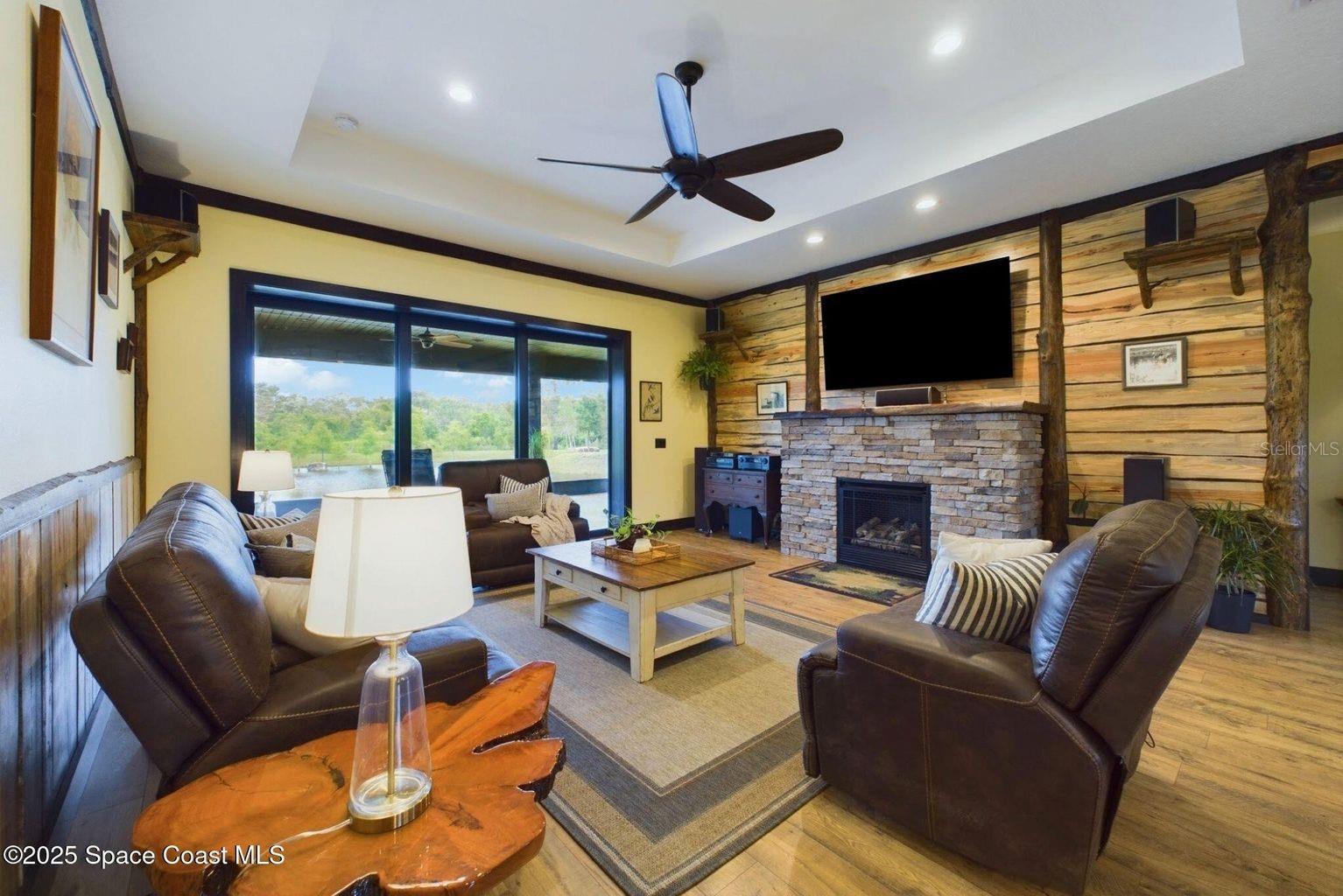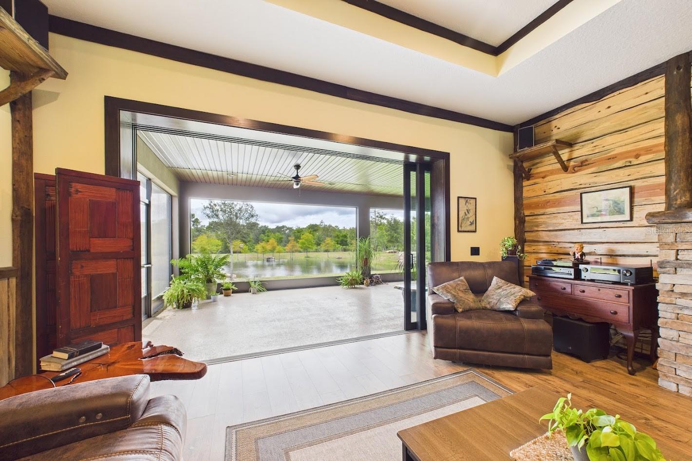 Experience refined seclusion in this custom CBS two bedroom two bathroom split floor plan estate on five peaceful acres. A private pond with an island, waterfall, and land bridges creates a remarkable setting for a luxury rural retreat. Beetle kill pine harvested from the property brings natural warmth to the thoughtfully designed interior. Triple sliding doors frame serene views and invite the outdoors in. The kitchen and baths feature granite counters and knotty pine accents. The primary bath offers a walk in shower and the guest bath includes a deep soaking tub. An oversized flex space holds laundry and includes a built in dog wash station. A forty by sixty pole barn, two RV hookups, and generous open space allow for future growth. Surrounded by more than three hundred trees, the property offers privacy and frequent wildlife sightings. Located at the end of a quiet road in an agricultural zone with no HOA and bordering a Wildlife Management Area, this retreat remains close to the Space Coast and Orlando amenities.