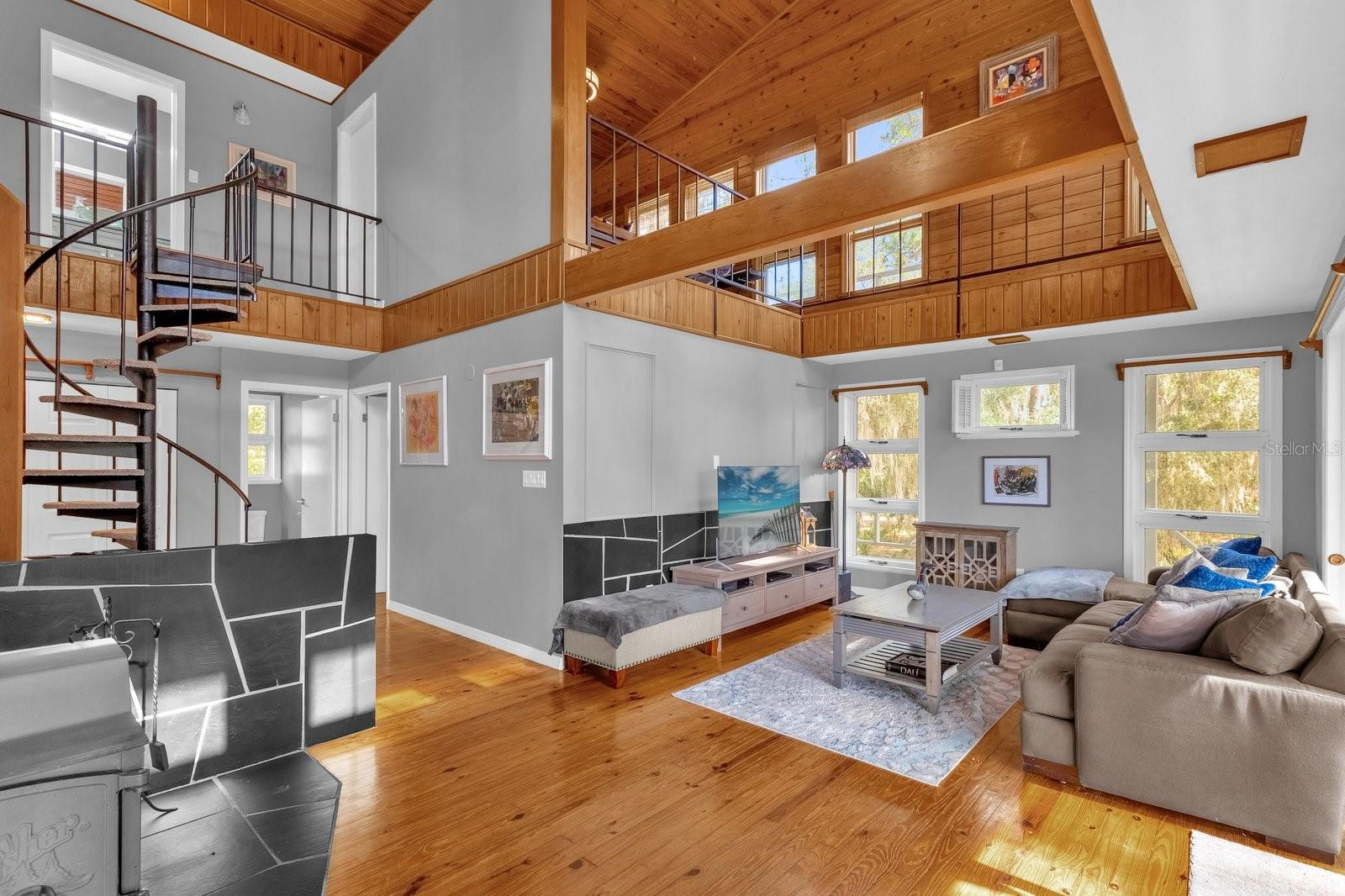 Recent upgrades include a new commercial-grade standing seam metal roof, updated electrical panels, a new AC system, upgraded garden sprinkler system, and a new deck with stairs. Outdoors, the 1.38-acre lot is adorned with majestic trees draped in Spanish moss and offers peaceful lake views from a first-floor covered porch, a second-floor wraparound balcony, and a third-floor balcony. The property includes a private boat dock on the secluded canal as well as an HOA shared launch slip.