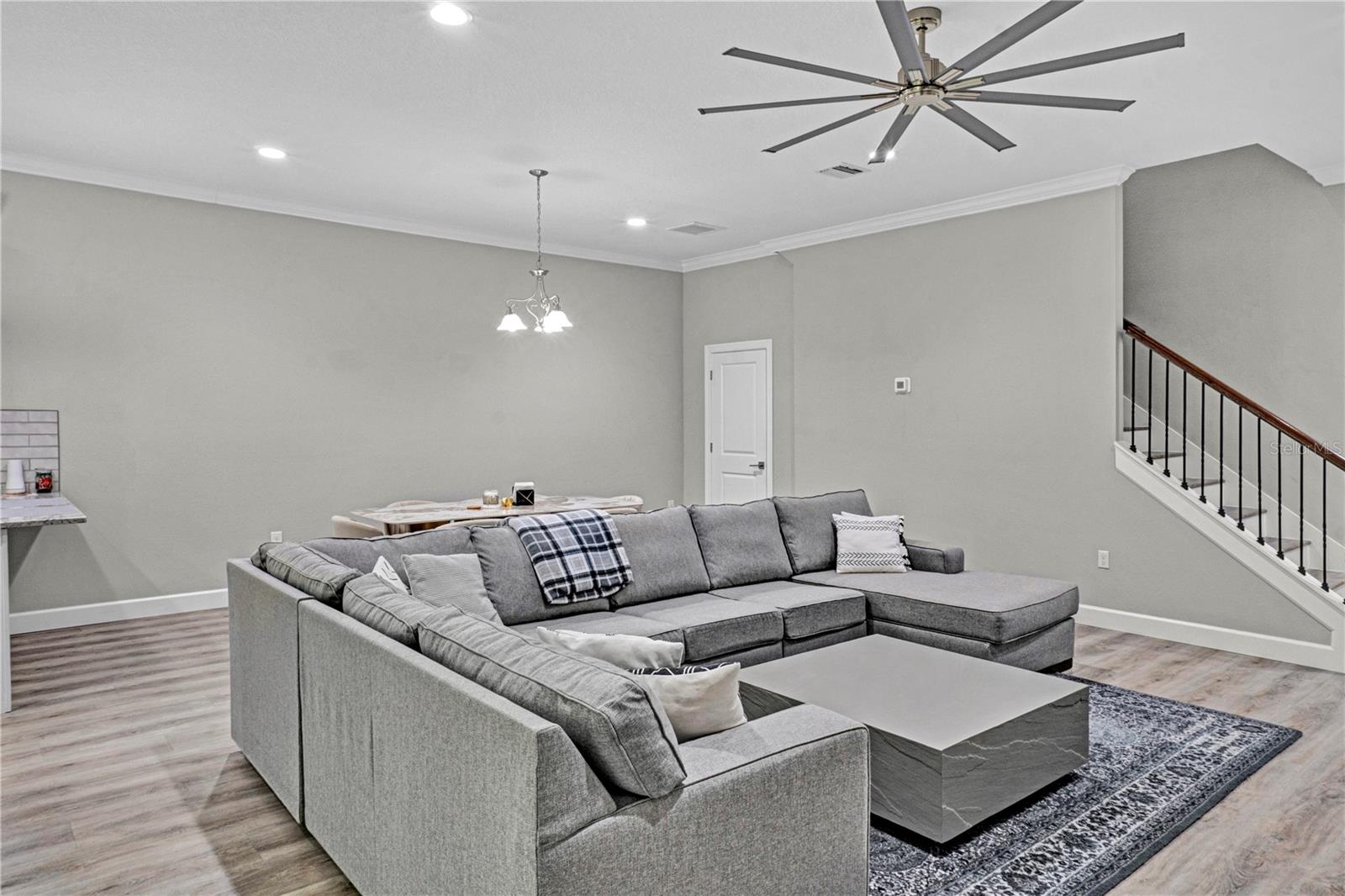 From the moment you arrive, the paver driveway and covered entryway invite you into a home filled with modern upgrades and finishes. Inside, you'll find soaring ceilings, luxury vinyl plank flooring, and a spacious open-concept layout. The main floor features a large great room, an elegant dining area, a guest powder bath, and a gourmet kitchen with granite countertops, subway tile backsplash, stainless steel appliances (including a natural gas range), custom soft-close cabinetry with crown molding, upgraded fixtures, recessed LED lighting, and plantation shutters throughout.