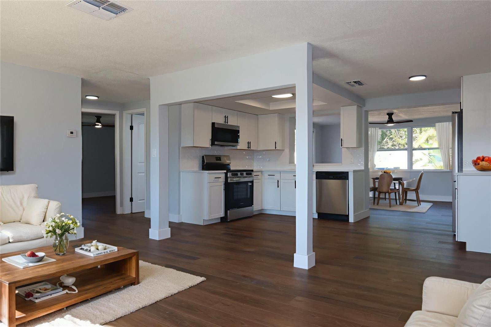 This beautifully updated property features a spacious open-concept living area seamlessly connected to the kitchen, creating a bright and inviting space ideal for everyday living and entertaining.