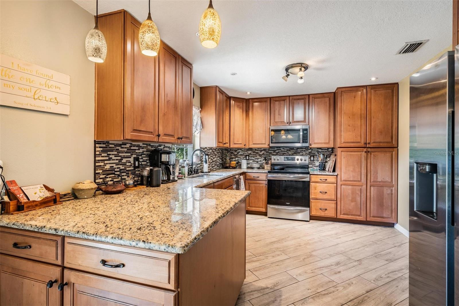 Step inside to an inviting, open-concept floor plan designed for easy Florida living. The vaulted ceilings and abundant natural light enhance the spacious feel of the living and dining areas, while durable tile and laminate flooring throughout make upkeep simple. The kitchen features stainless-steel appliances, ample cabinet space, a breakfast bar for casual dining, and direct access to both the living room and enclosed Florida room.