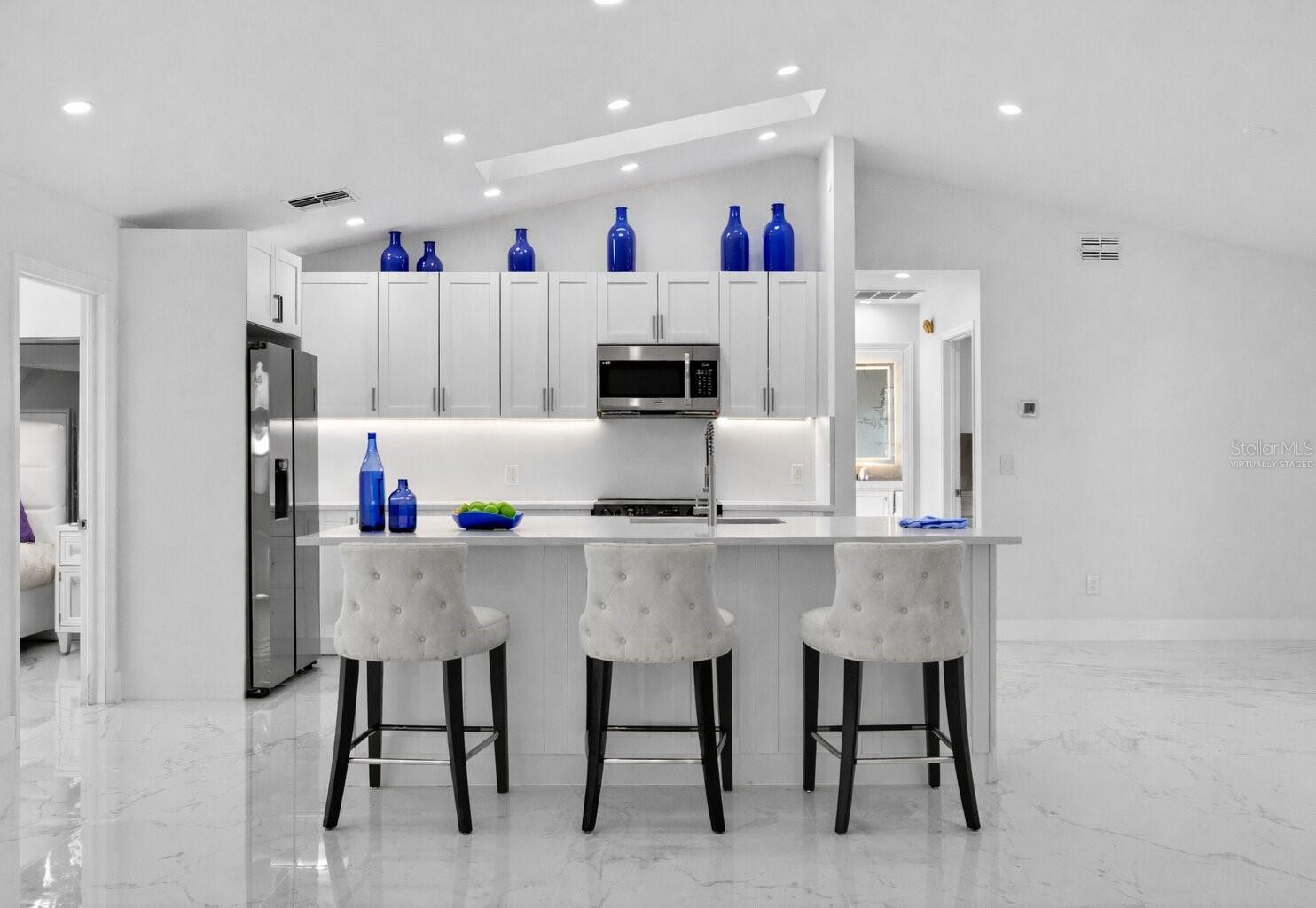 Completely renovated, spacious, with abundant interior space, 3 bedrooms, 2 bathrooms, 2-car garage, porcelain tile floors throughout, smooth finished walls, new bathrooms with floating ceilings and indirect lighting, wall-to-wall porcelain tile in all bathrooms, master bathroom with double sink, illuminated mirrors, walk-in closet in the master bedroom and spacious closets in the other bedrooms, new plumbing, new lighting, new Samsung appliances, new kitchen with ample storage cabinets and drawers for convenience, quartz countertops and full backsplash, under-cabinet lighting, a large skylight that provides natural light to the kitchen all day, integrated porch with giant sliding glass doors that disappear, giving you more space, Miami-style home, lots of natural light, a nice yard throughout, double garage with a driveway for 6 cars, this is a perfect house ready to move in.
