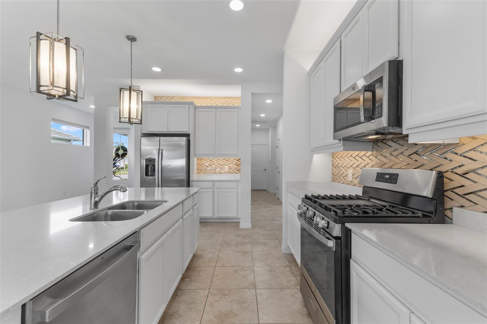 The kitchen is the heart of the residence — featuring premium cabinetry, quartz countertops, stainless-steel appliances, incredible backsplash a spacious island with seating that invites casual gatherings. The adjoining great room boasts large windows and sliding glass doors that open to the covered lanai, blending indoor and outdoor living in true Florida fashion.