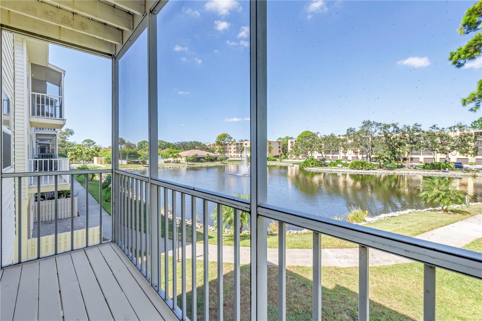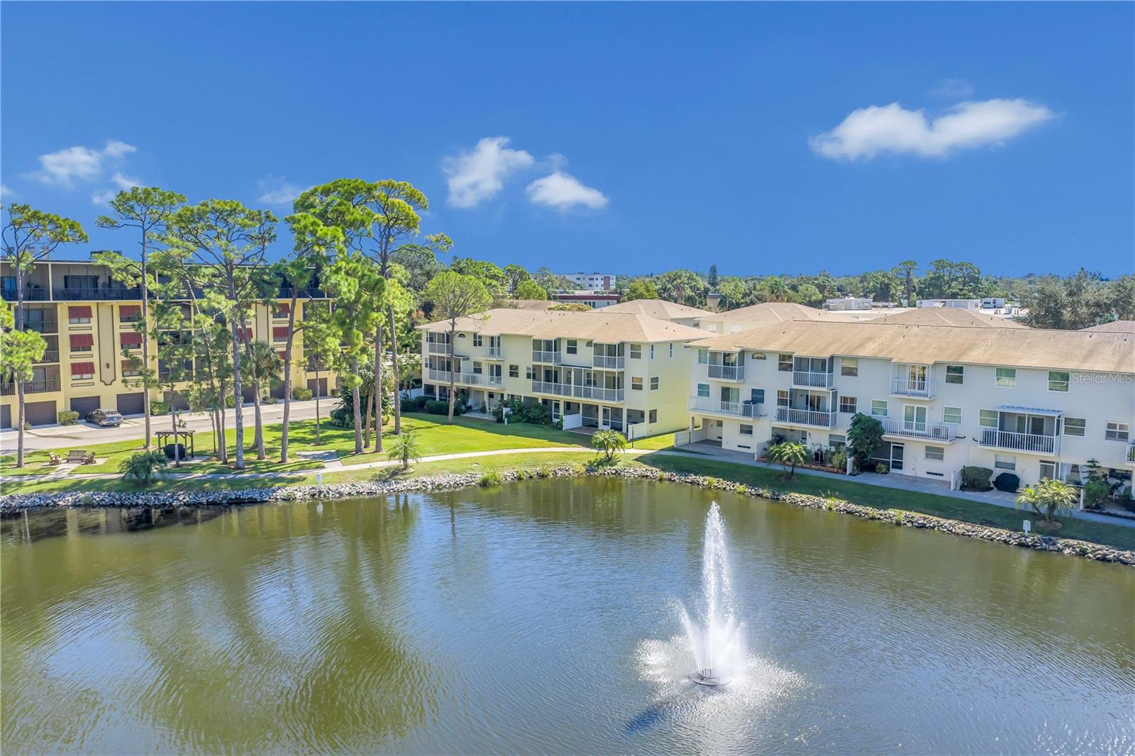 Rarely available lakeside townhouse, 3 bedroom, 3 bath, IMMACULATE CONDITION and views of gorgeous 30-foot fountain in charming lake from all three levels! Energy efficient windows and doors, and Hurricane rated garage door! Step out on your private screened balcony off the primary suite to start the day with the soothing sounds of fountain. Stroll along the sidewalk surrounding the lake that leads to the recreation building with Gym, entertaining space with a full kitchen, library and heated salt pool and heated Spa! Enjoy a relaxing game of shuffle board or play a game of tennis. Tastefully updated kitchen featuring solid surface counter tops and newer stainless-steel appliances makes any chef happy as you prepare a quick bite of full gourmet meal. Spacious formal living room could also serve as an intimate private dining room. Kitchen opens to the Great room providing ample space the for entertaining guests. Enjoy the natural light from the 2 screened balconies. Open the large sliding glass doors during the fall and winter to enjoy a cool breeze throughout your home. All 3 bedrooms are on the upper floor, two with walk in closets. Pest control with tubes in the wall. Newer A/C 2020. One of the best surprises is the INCREDIBLY OVERSIZED GARAGE, big enough for two large vehicles AND a huge workshop area with plenty of storage. Centrally located- 10 minutes to Gulf beaches, 20 minutes to downtown St. Pete. Close to Bay Pines VA Medical Center. Walking distance to Publix grocery store.