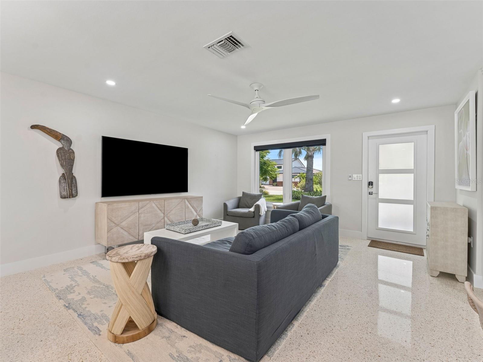 Welcome to your slice of paradise in one of St. Pete Beach’s most desirable neighborhoods—Bahia Shores. Perfectly positioned on a sought-after street, this fully updated home blends relaxed coastal living with sophisticated mid-century style. Wether you're looking for a primary home or a monthly/seasonal rental, this one is for you! Inside, sunlight pours through impact-rated, energy-efficient windows, highlighting an open-concept layout with elegant terrazzo floors and designer finishes. The heart of the home is the chef’s kitchen, complete with quartz countertops, custom cabinetry, and premium stainless steel appliances—ideal for hosting gatherings. Professionally remodeled by a published interior designer and contractor featured in Florida Design and Architectural Digest, this split-bedroom floor plan offers both privacy and comfort. The spacious primary suite feels like a spa retreat with a luxe ensuite bath featuring a Toto bidet, Kohler fixtures, and linen-weave porcelain tile. The guest bath matches the level of refinement with Calacatta Gold tile, another Toto bidet, and Kohler fixtures. A versatile third bedroom connects to the main living area, making it perfect for an office or bonus room. Additional highlights include a new standing seam metal roof for peace of mind, a large two-car garage with fresh epoxy flooring (plenty of room for your vehicles, golf cart, and more), and significant insurance savings thanks to the home’s energy-efficient upgrades. Step outside to a tropical backyard oasis, complete with lush landscaping, a covered paver patio, and plenty of space for barbecues or quiet evenings under the stars. Best of all, you’re just a short stroll to St. Pete Beach’s powdery sand, charming local shops, and award-winning restaurants. This is more than a home—it’s a lifestyle. Schedule your private showing today and see why Bahia Shores is one of the Gulf Coast’s most coveted communities.