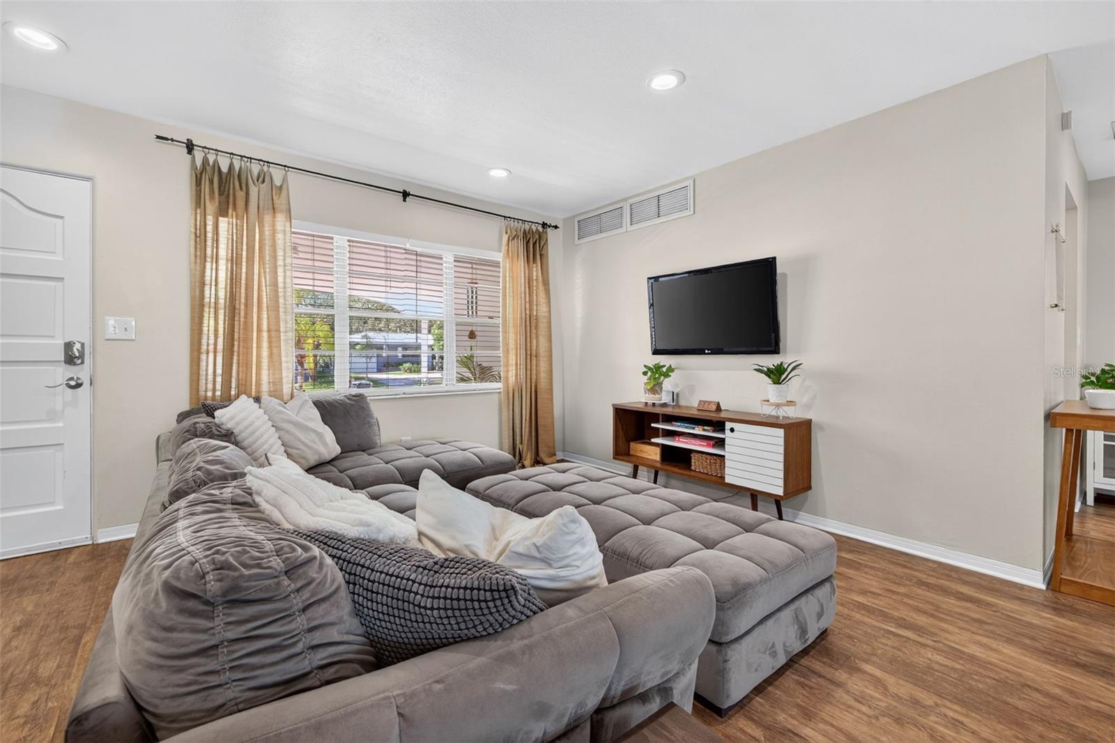 Welcome to this charming full-block home in the highly sought-after Jungle Prada neighborhood, featuring a perfect blend of architectural character and modern updates. This beauty features 3 bedrooms, 2 full baths, and 1,618 square feet of living space, that is thoughtfully designed to provide both comfort and functionality. From the moment you arrive, the oversized one-car attached garage, circular driveway, and welcoming covered front porch create a warm first impression. Inside, the open layout is enhanced by updated lighting, ceiling fans, and durable laminate flooring that flows seamlessly throughout the home. The kitchen is a true standout, showcasing granite countertops, stainless steel appliances, and ample cabinetry—ideal for both everyday meals and entertaining. Additional highlights include a large laundry room with extra storage, a versatile study/flex space perfect for a home office or creative studio, and newer windows that bring in abundant natural light. The spacious bedrooms and updated bathrooms complete the home’s inviting interior. Large backyard with plenty of room to enjoy the outdoors and is located just 2 doors down from a private entrance to Abercrombie Park, and is minutes away from Doc Fords, Walter Fuller Park, specialty waterfront dining, shopping, and all the best of the St. Petersburg's lifestyle and Florida's award winning gulf beaches. Combining classic curb appeal with modern conveniences, this home sits high and dry and is an exceptional opportunity in one of the area’s most charming neighborhoods. The pool rendering is virtually staged.
