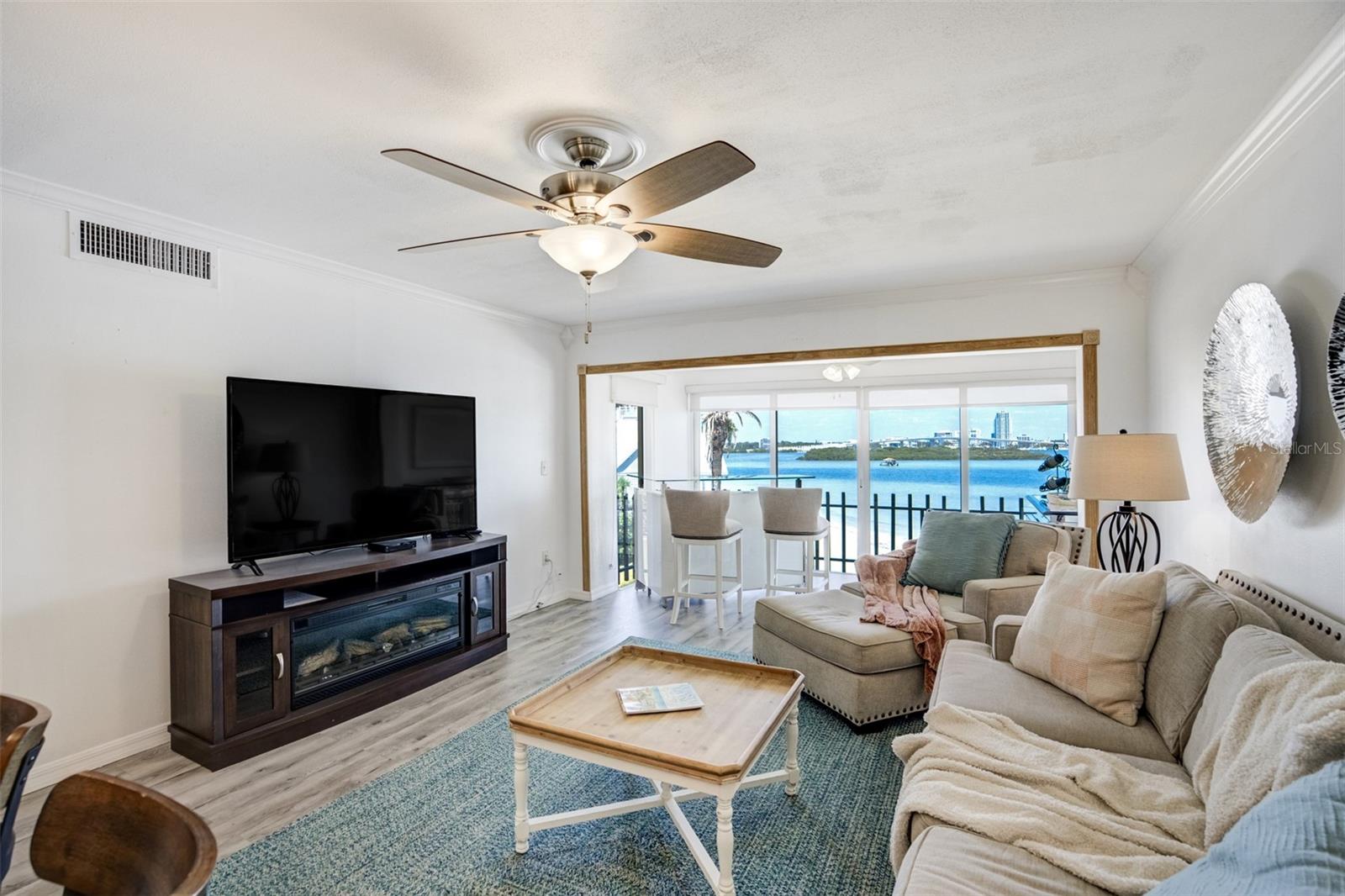 This light-filled residence boasts an open, inviting layout designed for comfort and effortless entertaining. The spacious living and dining areas flow seamlessly into the well-appointed kitchen, all framed by large windows that flood the space with natural light and showcase endless water views.