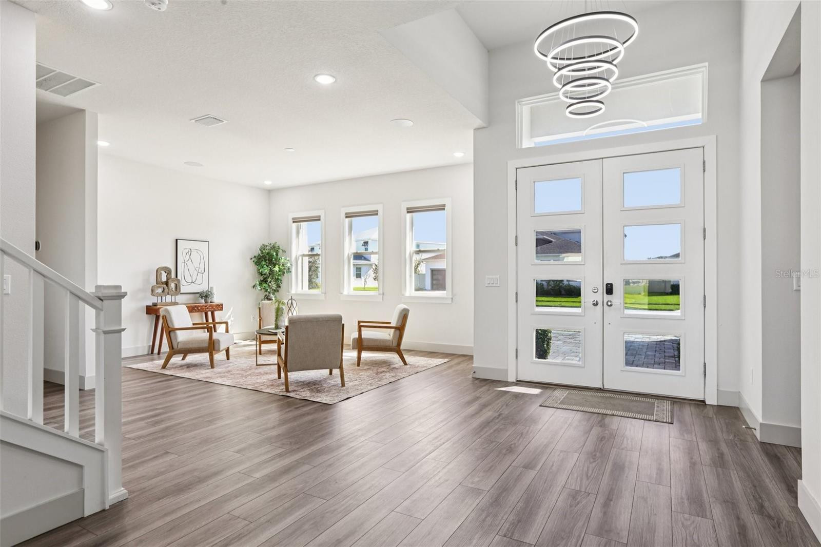 Covered paver patio with serene water views. VASTU COMPLIANT: Thoughtfully oriented to promote well-being, prosperity, and harmonious living. The Epperson community offers lagoon access with 7 acres of crystal-clear water, a swim-up bar, kayaking, paddleboarding, cabanas, live music, golf cart parades, top-rated schools, and included high-speed internet. Minutes from shopping/dining, 35 minutes to Tampa International Airport. KEY FEATURES