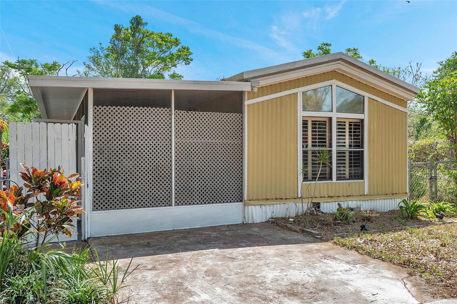 This home offers an excellent opportunity for affordable Florida living with both indoor and outdoor space to enjoy. A gated entry leads you to a spacious front patio area surrounded by mature tropical landscaping — perfect for relaxing or entertaining. There’s also a convenient storage shed for your tools or beach gear.