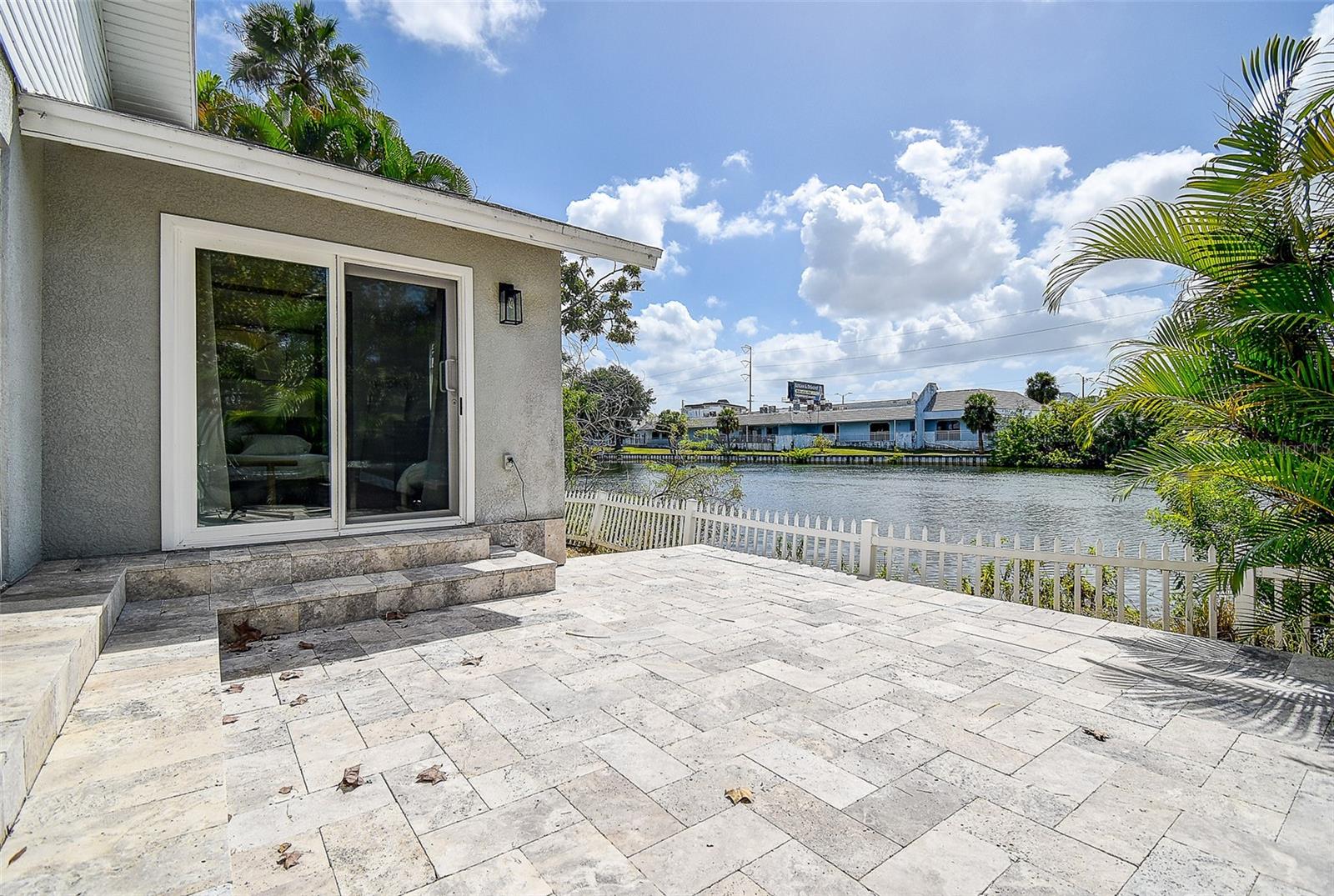 The kitchen is truly a standout, featuring an unusually generous amount of counter space, ideal for those who love to cook, entertain, and spread out. Ample cabinet storage and an open flow into the dining and living areas make this home as functional as it is beautiful. Both the main living area and master bedroom open through sliding glass doors to a gorgeous travertine patio overlooking a peaceful water view, providing a serene backdrop for morning coffee or evening relaxation.