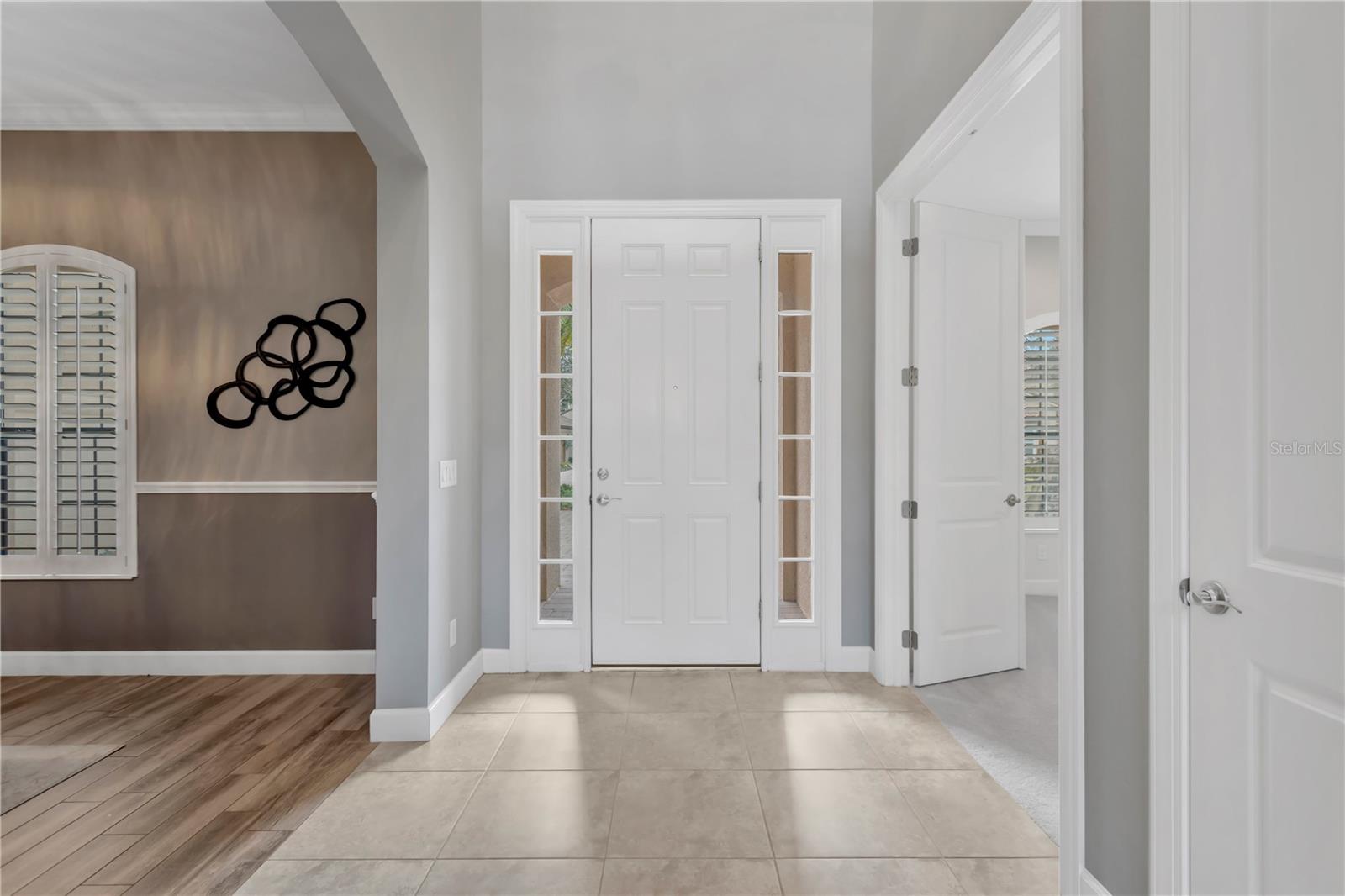 - Interior Features: Ceiling Fans(s), Chair Rail, Crown Molding, Eat-in Kitchen, High Ceilings, In Wall Pest System, Kitchen/Family Room Combo, Pest Guard System, Primary Bedroom Main Floor, Solid Surface Counters, Solid Wood Cabinets, Split Bedroom, Stone Counters, Thermostat, Vaulted Ceiling(s), Walk-In Closet(s), Window Treatments