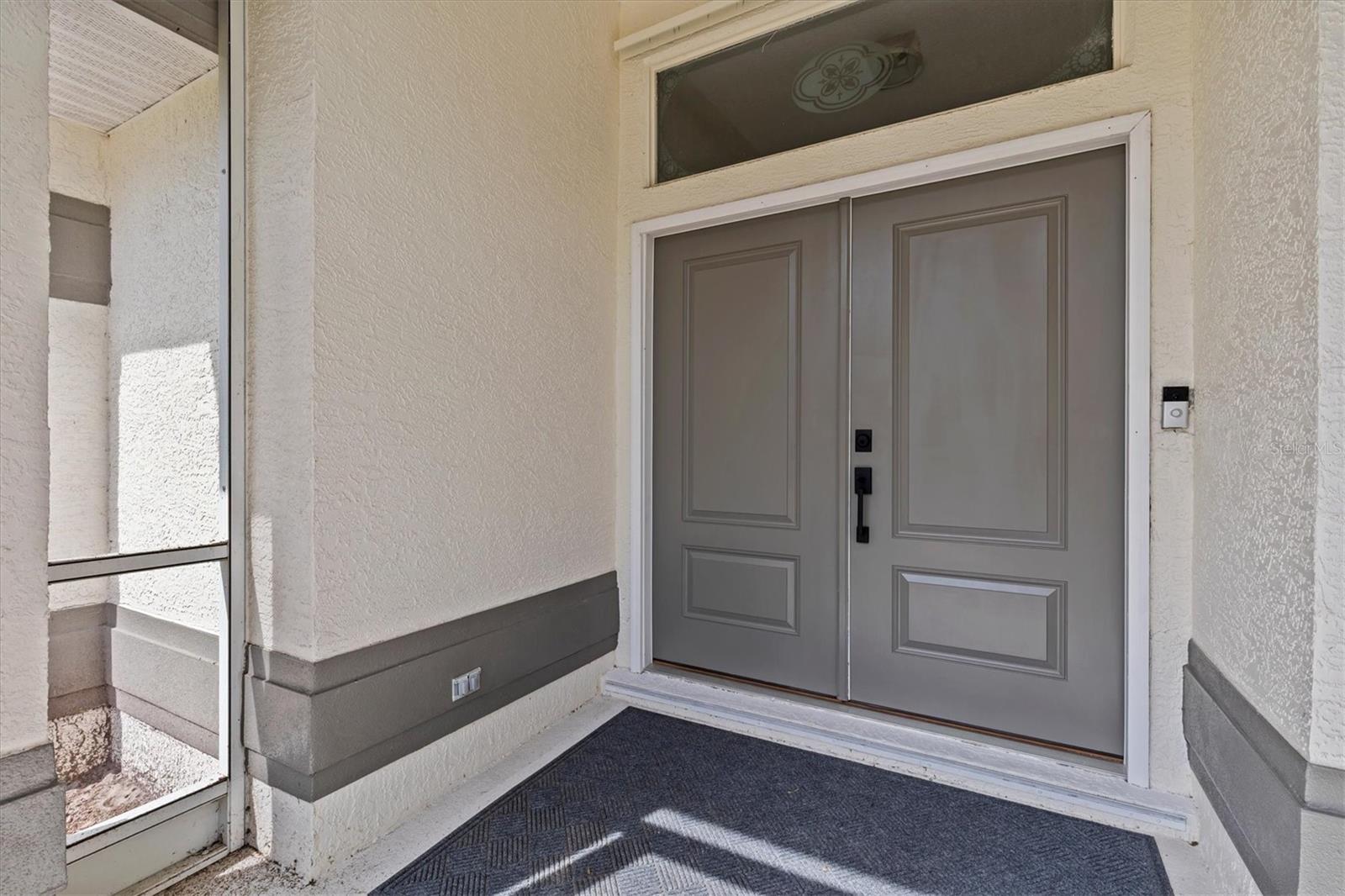 From the moment you arrive, the home welcomes you with an enclosed screened entry and attractive double doors that open to a thoughtfully designed split-bedroom floor plan. A formal living and dining room create an elegant first impression, with the dining space highlighted by a bay window fitted with plantation shutters. The living room extends gracefully to a screened lanai and saltwater pool, where tranquil pond views provide a serene backdrop.