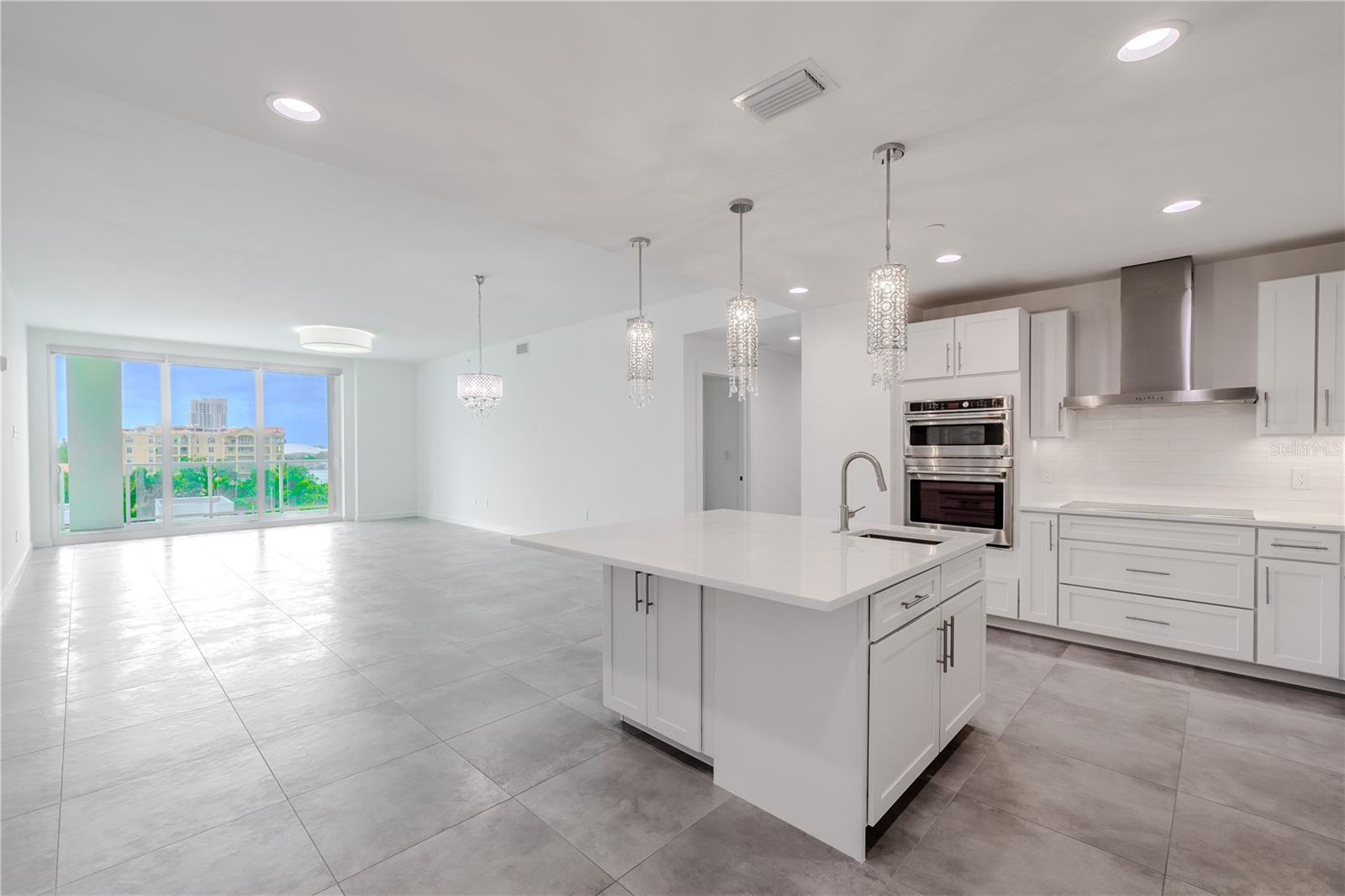 The gourmet kitchen features sleek cabinetry, quartz countertops, and an oversized island with seating, framed by elegant crystal pendant lighting. The kitchen is outfitted with a full suite of premium stainless-steel appliances, including a French door refrigerator, wall oven, dishwasher and built-in microwave. A custom walk-in pantry includes pull-out drawers, adjustable shelving, and closed cabinetry designed for organization and ease.