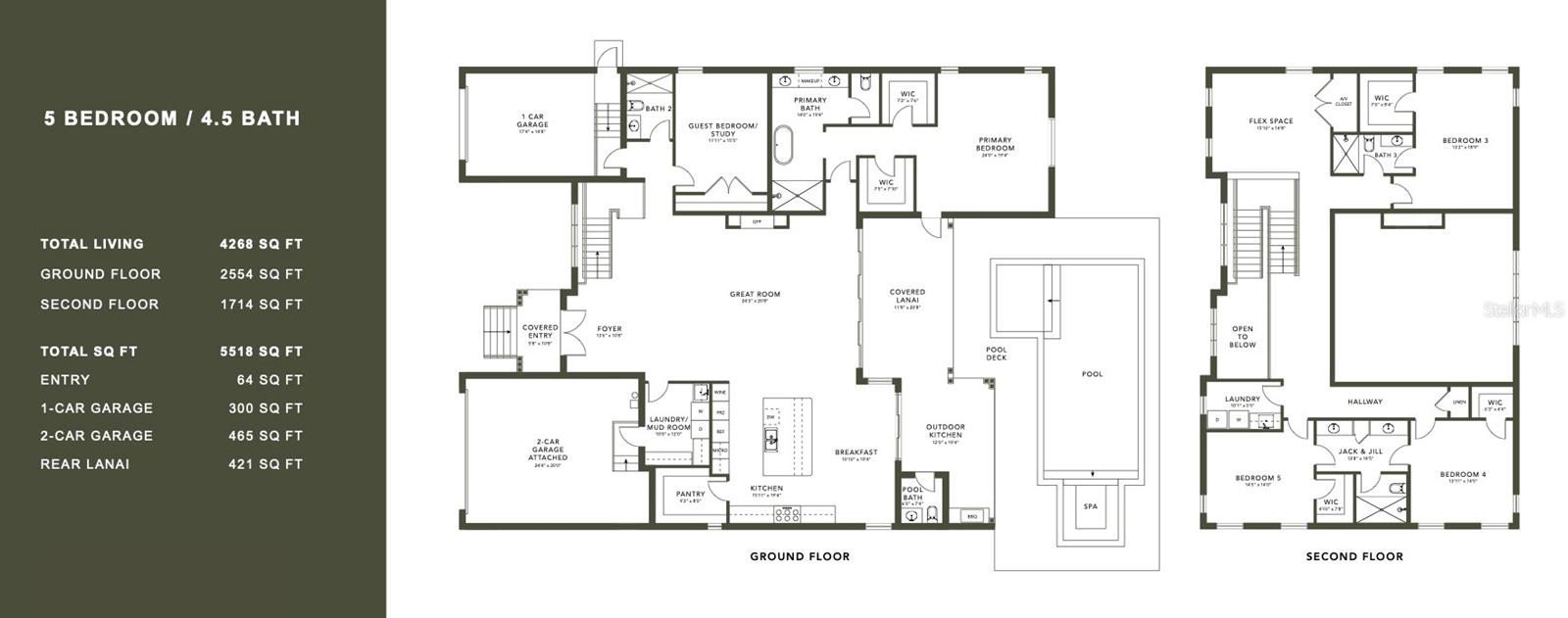 Step outside to enjoy the luxury of a heated pool with a spillover spa, situated within an expansive outdoor living area perfect for relaxation and entertaining. A covered lanai extends your enjoyment year-round, featuring a built-in BBQ grill and a poolside half bath.