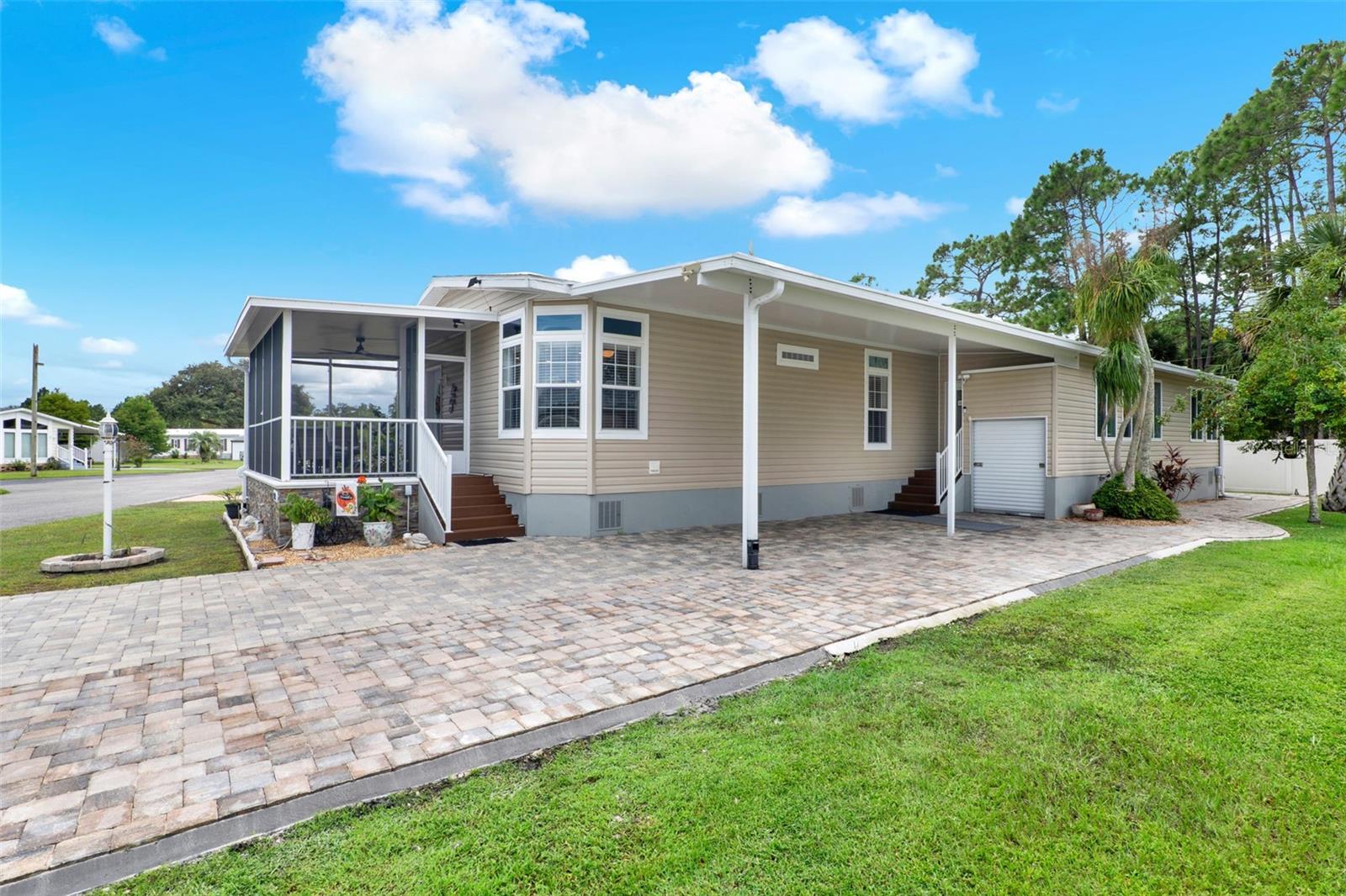 Welcome to Kove Estates.. Where do I begin with this HOME.. So many features, so little time..This 2018 Modular Home is over 2100sq Ft Under Heat and Air, on a Concrete Base Floor with tons of undercarriage storage. Building records state it is Category 3 Hurricane safe. This 3 Bedroom 2 Bathrooms homes has so much to desire. As you walk up you're greeted by a large screened in porch perfect for morning coffee and visiting with friends. As you enter you are welcomed with a Formal living area equipped with a Coffee/Wine wet Bar perfect for entertaining guest. Tons of natural light, Large Open Family Room overlooking a beautiful kitchen with cabinets galore, Large Kitchen Island, GinAir Cooktop with Exhaust, Newer Refrigerator 2024, Laundry Room with built in pantry storage, Recess lighting and desk area. Large Primary Suite with an on suite bathroom features dual sinks, walk-in shower, walk-in closet, lots of storage. Two additional bedrooms and full secondary bathroom. Large enclosed Sunroom perfect for additional living/storage area. This house also features a Full house Central Vacuum, Crown Molding throughout, extended Paver Driveway, Back Porch with Trek Deck overlooking Large Private Estate, Water Softener, House Generator and Lots of Storage, Newly Repainted Interior 2024 Newer Washer 2024. KOVE ESTATE is a 55+ CO-OP Community Resort Style Living at its finest, enjoy all the thrills without all the fuss. There is no lot rent, as a share in the community conveys with the sale. With a monthly cooperative fee of $270 which allows you to Enjoy Year Round 9 Hole Golf Course, 2 pools, one heated, tennis courts, pickle-ball, community events and the peaceful nights all in your very own gated community. Located just outside of Historical Sanford Fl. Sanford Airport is minutes away, Daytona Beach 40 minutes, Disney 45 Minutes away. The perfect spot to call home.