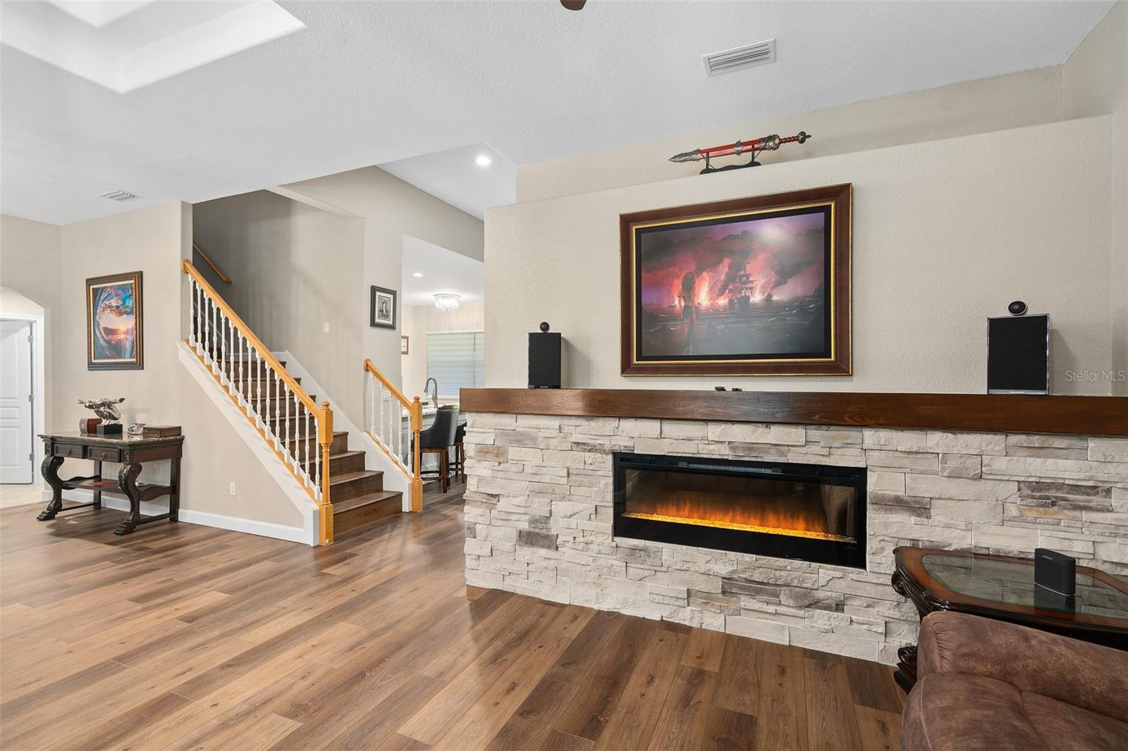 Interior Elegance & Architectural Detail: Gourmet chef’s kitchen with waterfall-edge stone island, dual stainless ovens, deep dish sink, dovetail cabinetry, and stone backsplash—designed to impress and perform. Grand foyer crowned with a double tray ceiling and custom chandelier sets the tone for the elegance that follows.Wide-plank luxury vinyl flooring flows seamlessly throughout all main living areas and the upper level. Electric fireplace with custom stone inlay and plank mantel offers a warm, designer focal point. Zebra-style window shades and a freshly painted palette elevate modern elegance. Private Sanctuary: Retreat to a lavish downstairs primary suite featuring: