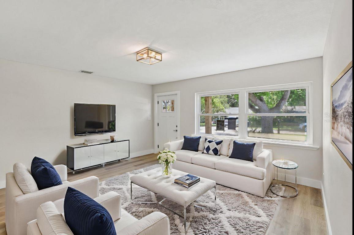 Welcome to this beautifully renovated 3-bedroom, 2-bathroom home located in the heart of Dunedin, Florida. Offering 1,672 square feet of living space, this property blends modern luxury with everyday practicality—situated on high and dry land, outside of a flood zone, and untouched by hurricane or storm damage. With no HOA, a one-car garage, ample street parking, and a brand-new paver driveway, convenience is built right in. This home is also nestled in a golf cart-friendly neighborhood, adding to the charm and accessibility of the Dunedin lifestyle. Inside, you’ll be greeted by a fully updated interior featuring luxury LVP flooring throughout, hurricane-impact windows and doors, and a bright, open layout perfect for entertaining. The kitchen is a standout, showcasing white shaker cabinets, white quartz countertops, a tile backsplash, a deep stainless steel farmhouse sink, a microwave drawer, a stainless steel range hood, and brand-new stainless steel appliances—a dream for any home chef. Both bathrooms have been tastefully remodeled with sleek LED anti-fog mirrors and modern finishes, while the home also includes an air-conditioned laundry room for added convenience. Step outside to enjoy the completely resodded yard, luxury landscaping, and a new sprinkler system that ensures year-round curb appeal. Whether you’re hosting friends or just enjoying a quiet Florida evening, this outdoor space is ready to impress. All of this is located just minutes from downtown Dunedin, offering quick access to award-winning beaches, vibrant restaurants and breweries, charming boutiques, top-rated medical facilities, and the scenic Pinellas Trail. Whether you’re looking for a full-time residence or a seasonal retreat, this move-in-ready home delivers comfort, convenience, and quality in one of the area’s most sought-after communities.