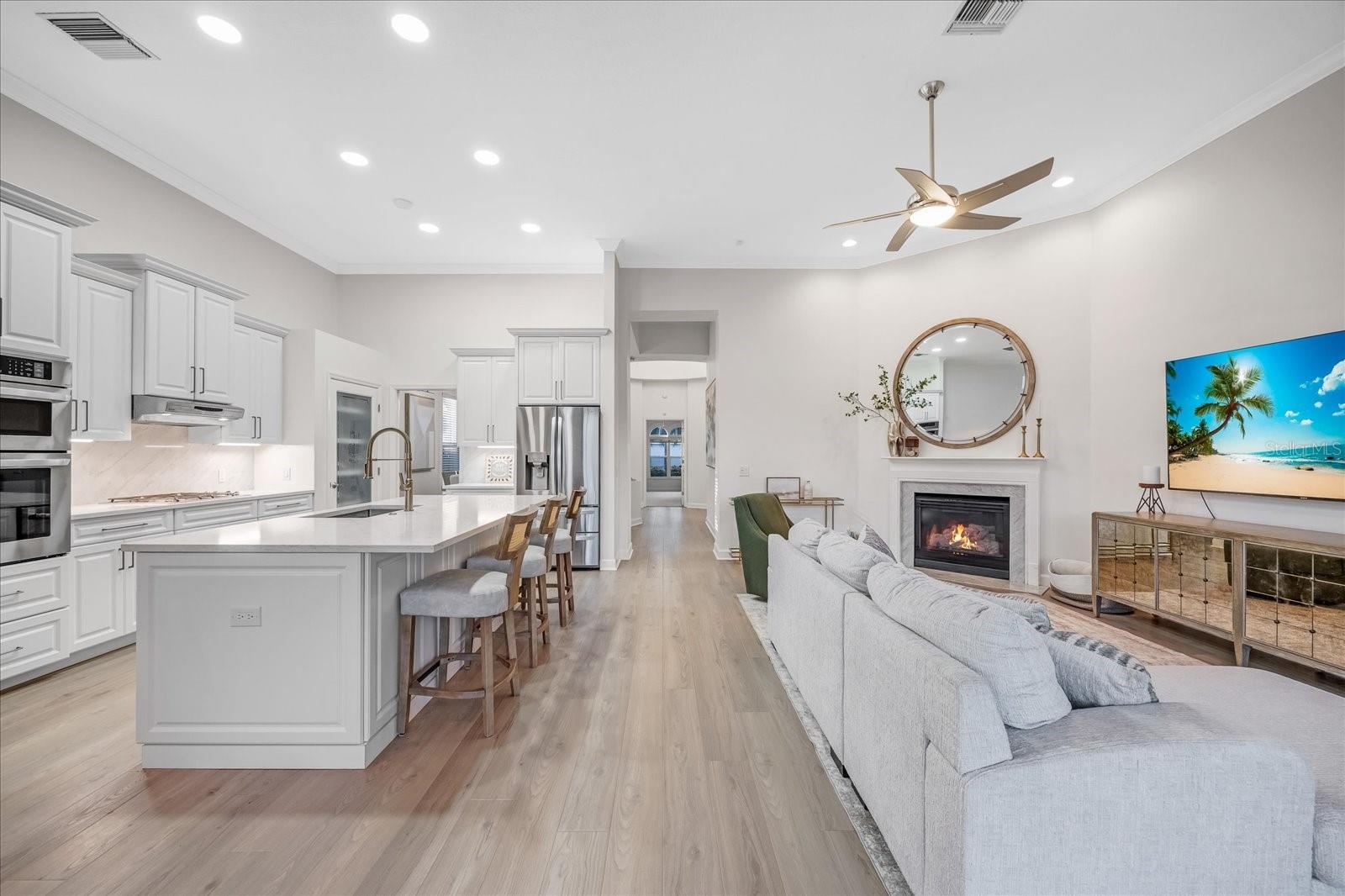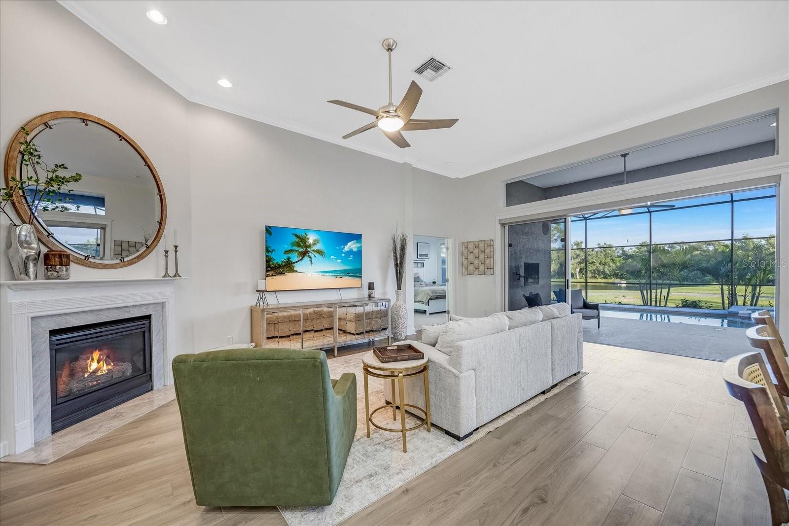 Experience refined Florida living in this Elegant, thoughtfully Remodeled Golf Course Pool Home where Timeless Design meets Modern Comfort featuring Elevated Design, a Brand New Kitchen, and Tranquil Private Views in the Highly Sought after Bayou Club. Welcome to 9773 Sago Point Drive, a stunning single-story residence designed for both comfort and entertaining. From the moment you step into the grand entry with soaring ceilings and an elegant chandelier, you will appreciate the thoughtful design and high-end finishes throughout. The living room flows into the outdoor living space with wide pocket sliding doors that open to the enclosed heated pool, creating a seamless indoor-outdoor experience perfect for gatherings. A cozy gas fireplace adds charm, while abundant natural light and tall ceilings make the home feel bright and inviting. The remodeled kitchen (2025) is a chef’s dream with a gas cooktop, custom cabinetry, quartz counters, and stylish finishes. The split floorplan provides privacy, with the primary suite offering wooded and golf course views, a bay window, dual closets, and a spa-like ensuite featuring dual vanities, a jetted garden tub, and a walk-in shower.