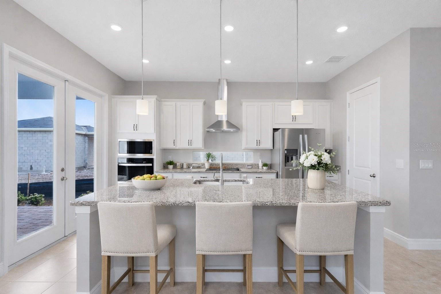 One or more photo(s) has been virtually staged. This stylish 4-bedroom, 3.5-bath home with a full 1-bedroom, 1-bath garage apartment is set in Lake Nona’s most sought-after community of Laureate Park. Offered at nearly $100,000 below current builder pricing for the same Dream Finders Mason model with garage apartment, this home presents a rare opportunity to secure new construction at exceptional value. The welcoming blue exterior and covered front porch create instant curb appeal, leading into a bright, open interior filled with natural light. The main level features seamless living, dining, and kitchen spaces with neutral tile flooring throughout. The chef’s kitchen showcases white shaker cabinets, quartz countertops, stainless steel appliances, a sleek vent hood, and a spacious island with bar seating. French doors open to a private courtyard-style patio, ideal for entertaining and indoor-outdoor living.