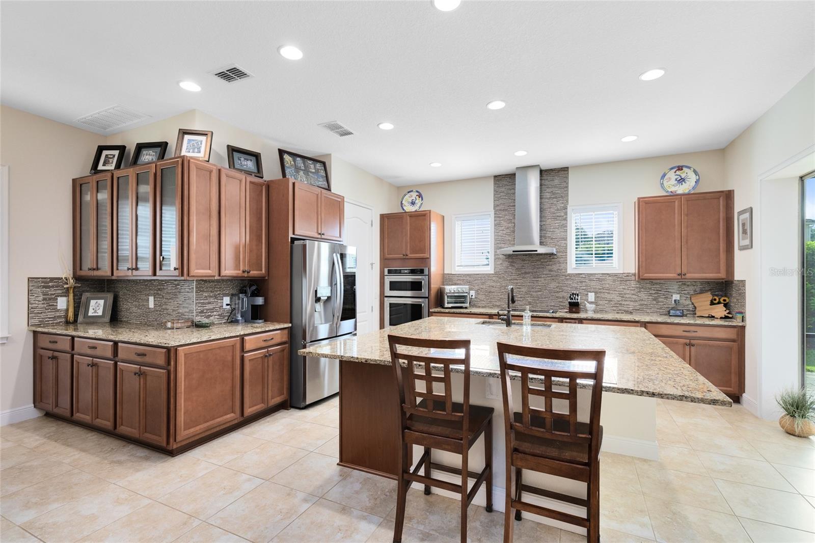 From the moment you arrive, the Mediterranean-inspired exterior, tile roof, paver driveway, and lush landscaping make a striking impression. Step inside to a bright, open layout where the great room flows into the dining space and chef-style kitchen. Enjoy granite countertops, rich wood cabinetry, stainless steel appliances, designer backsplash, and a spacious island perfect for entertaining.