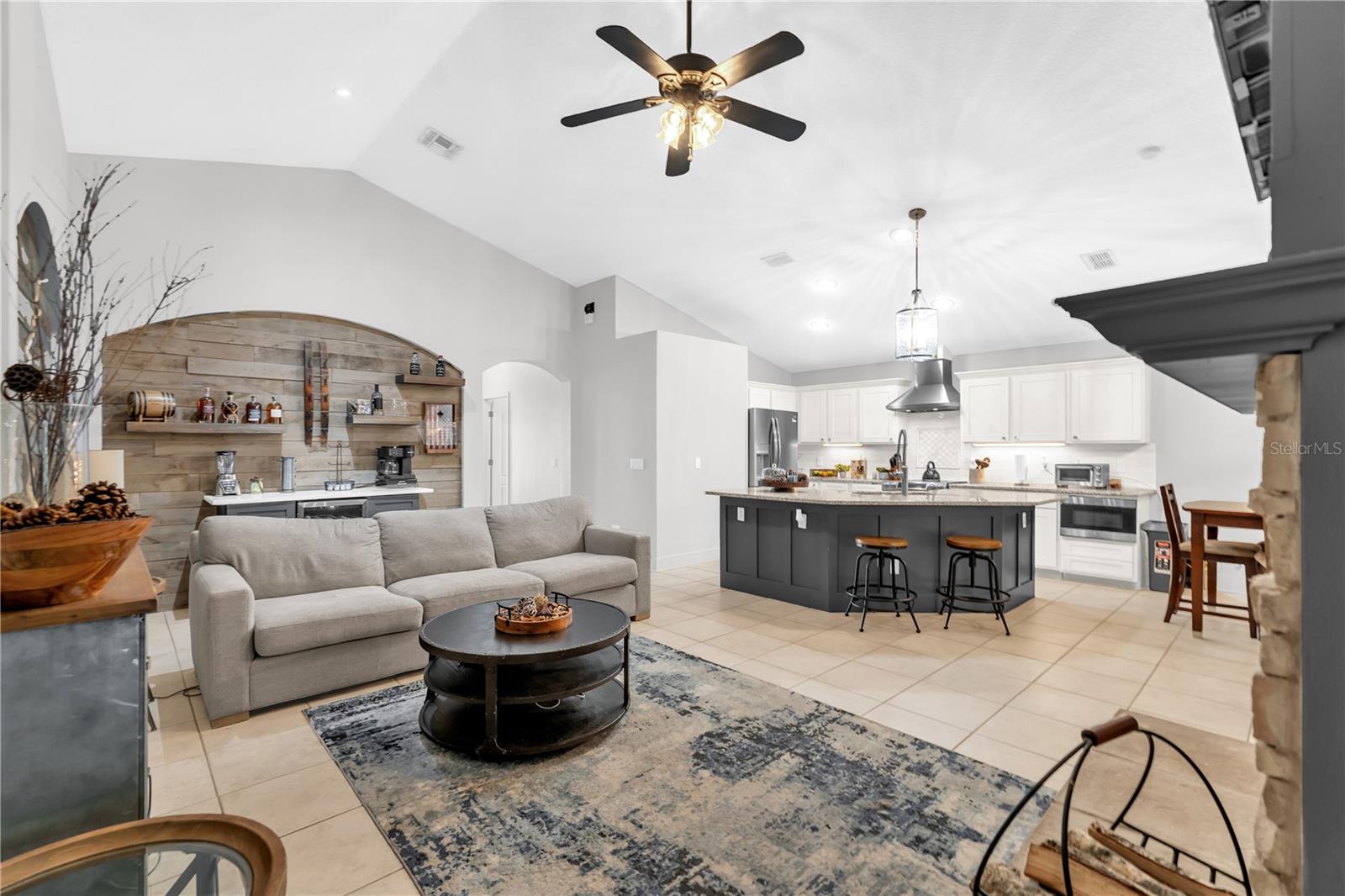 - Interior Features: Cathedral Ceiling(s), Ceiling Fans(s), Dry Bar, Eat-in Kitchen, High Ceilings, Kitchen/Family Room Combo, Living Room/Dining Room Combo, Open Floorplan, Primary Bedroom Main Floor, Solid Surface Counters, Stone Counters, Thermostat, Tray Ceiling(s), Vaulted Ceiling(s), Walk-In Closet(s), Wet Bar, Window Treatments